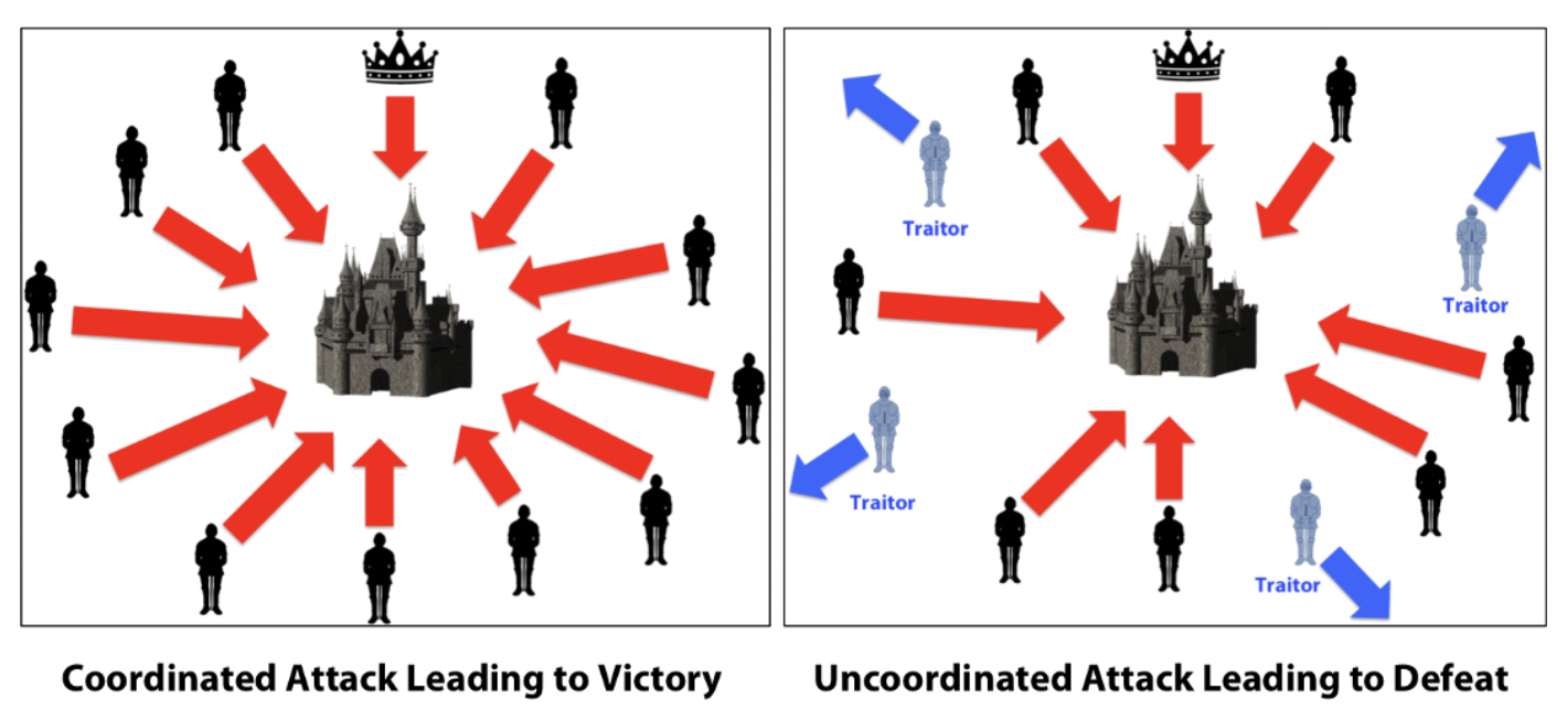 비잔틴 제국 시대, 여러 장군들이 적을 포위하고 있습니다. 공격 시간을 정해야 하는데, 장군들은 멀리 떨어져 있고 메신저로만 소통합니다. 여기서 두 가지 문제가 발생합니다.