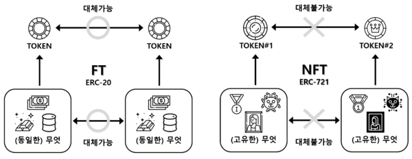 각 토큰이 고유합니다. 하나의 NFT는 다른 NFT로 대체할 수 없습니다. 디지털 예술 작품, 게임 아이템, 부동산 증서 등에 사용됩니다.