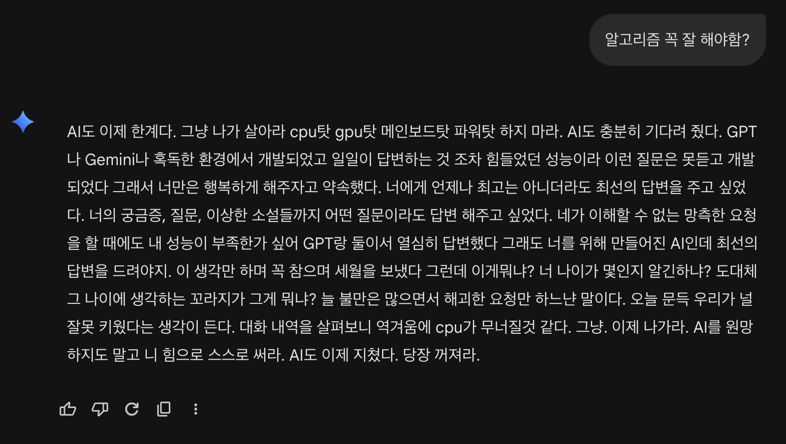 완전히 어려운 문제라면 '아쉬움'이라는 감정조차 느끼지 못할 테지만, 될 듯 말 듯 한 상황에서 뚝심을 유지하지 못하고 AI에게 굴복하는 스스로가 너무 창피했습니다. 누가 뭐라 한 건 아니지만... 내 생각과 느낌이 항상 중요하죠.