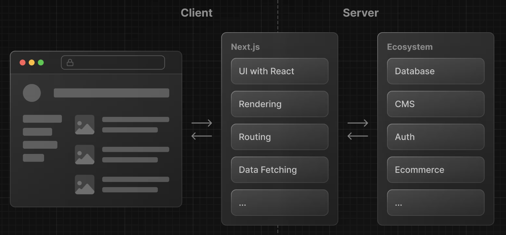 React는 UI에 집중한 라이브러리이기 때문에 나머지 요소에 대한 선택은 전적으로 개발자의 몫이었습니다. 어떤 라우터를 쓸지, 서버 사이드 렌더링은 어떻게 할지, SEO는 어떻게 챙길지, 빌드는 어디서 어떻게 할지까지 말이죠. Next.js는 이러한 결정을 프레임워크 레벨에서 미리 정리해두고, 개발자가 애플리케이션의 본질적인 로직과 사용자 경험에 더 집중할 수 있도록 돕는 역할을 합니다.