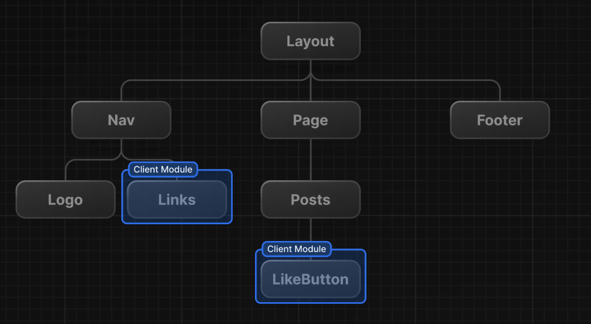 이미지에 나타난 Layout, Nav, Page, Posts는 서버 컴포넌트입니다. 반면 파란색 테두리로 감싸진 Links와 LikeButton은 클라이언트 컴포넌트입니다. React는 빌드 시점에 위 이미지와 같은 트리를 보고 서버용 설계도와 클라이언트용 설계도 두 가지로 구분합니다.