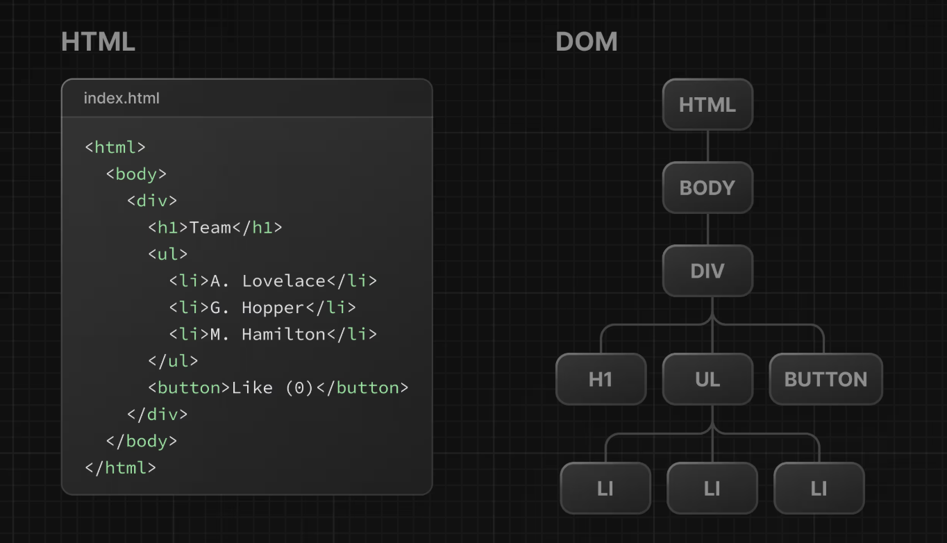 그래서 브라우저는 HTML을 변경 가능한 대상으로 두지 않고, DOM이라는 중간 표현 계층을 두었습니다. JavaScript는 HTML이 아닌 DOM을 수정하고, 브라우저는 변경된 DOM을 기준으로 필요한 부분만 다시 렌더링 합니다.