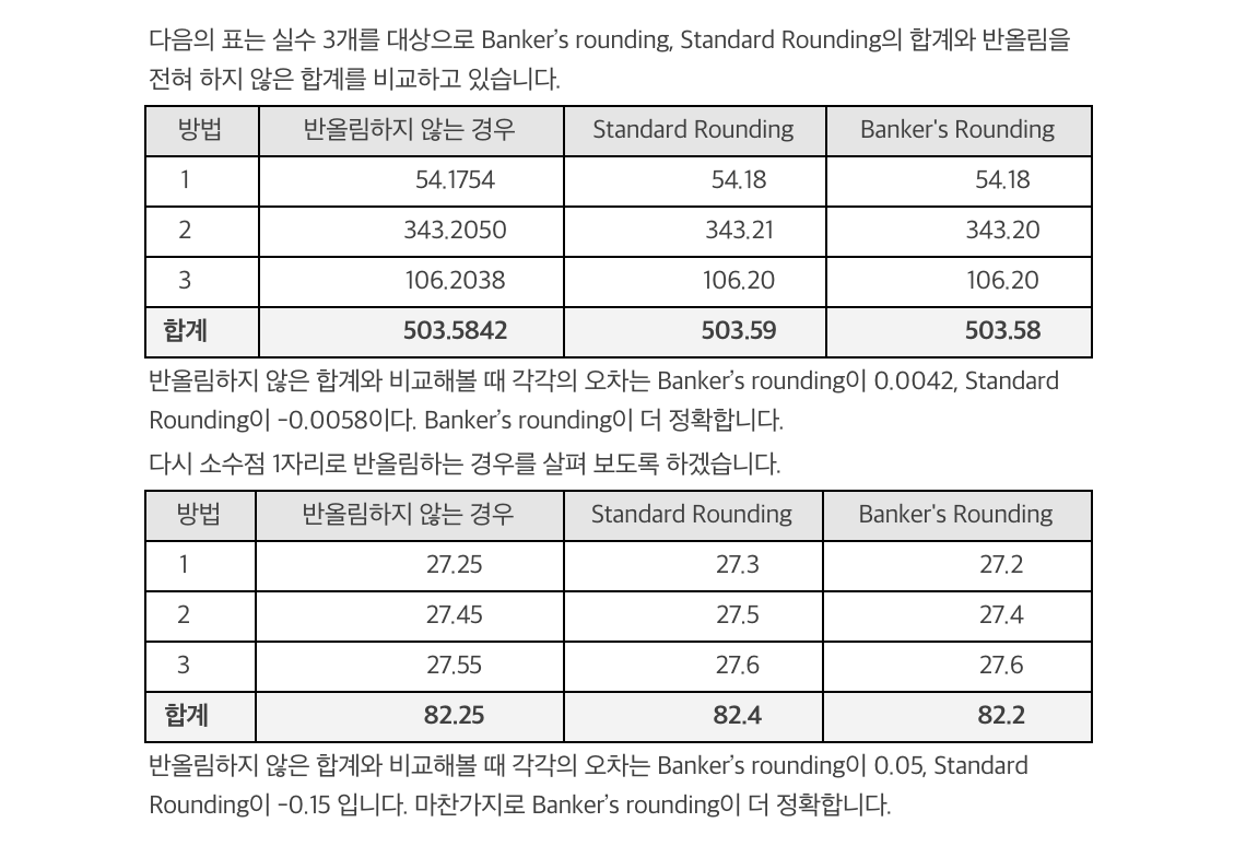 추가적으로 은행가의 반올림(Banker’s rounding)에 대해 알아두면 좋습니다. 은행가의 반올림은 소수 부분이 .5 일 때 가장 가까운 '짝수'로 반올림하는 방식입니다.