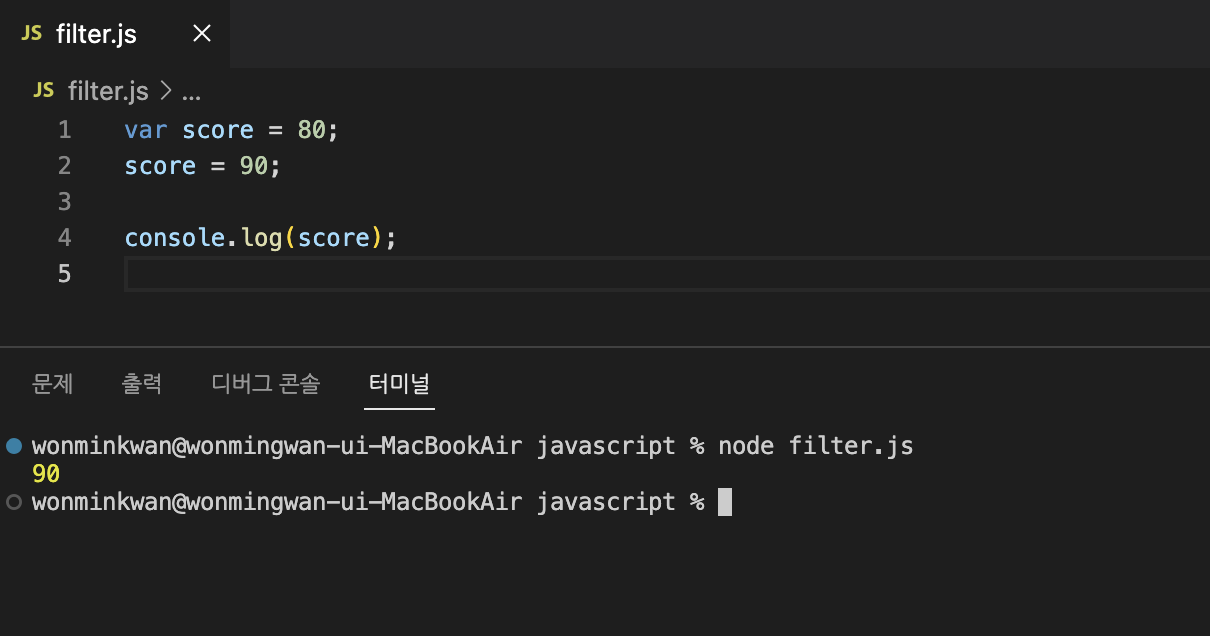80이라는 값을 할당했던 'score'라는 변수에, '90'이라는 새로운 값을 할당했다. 이것이 '재할당'이다. 'var 키워드'로 선언한 변수는 값을 재할당할 수 있다. 바뀔 수 있어서 '변수'이다. 만약 값을 재할당할 수 없다면 변수라고 할 수 없고 상수(constant)라고 불러야 한다.