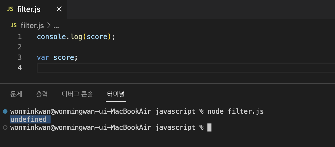 그렇다면 위 코드는 ReferenceError가 발생했어야 마땅하다. 'score'라는 변수의 선언이 실행되기도 전에, 변수를 참조하는 코드가 실행되고 있기 때문이다. 그런데 Error가 아니라 'undefined'가 출력되었다.