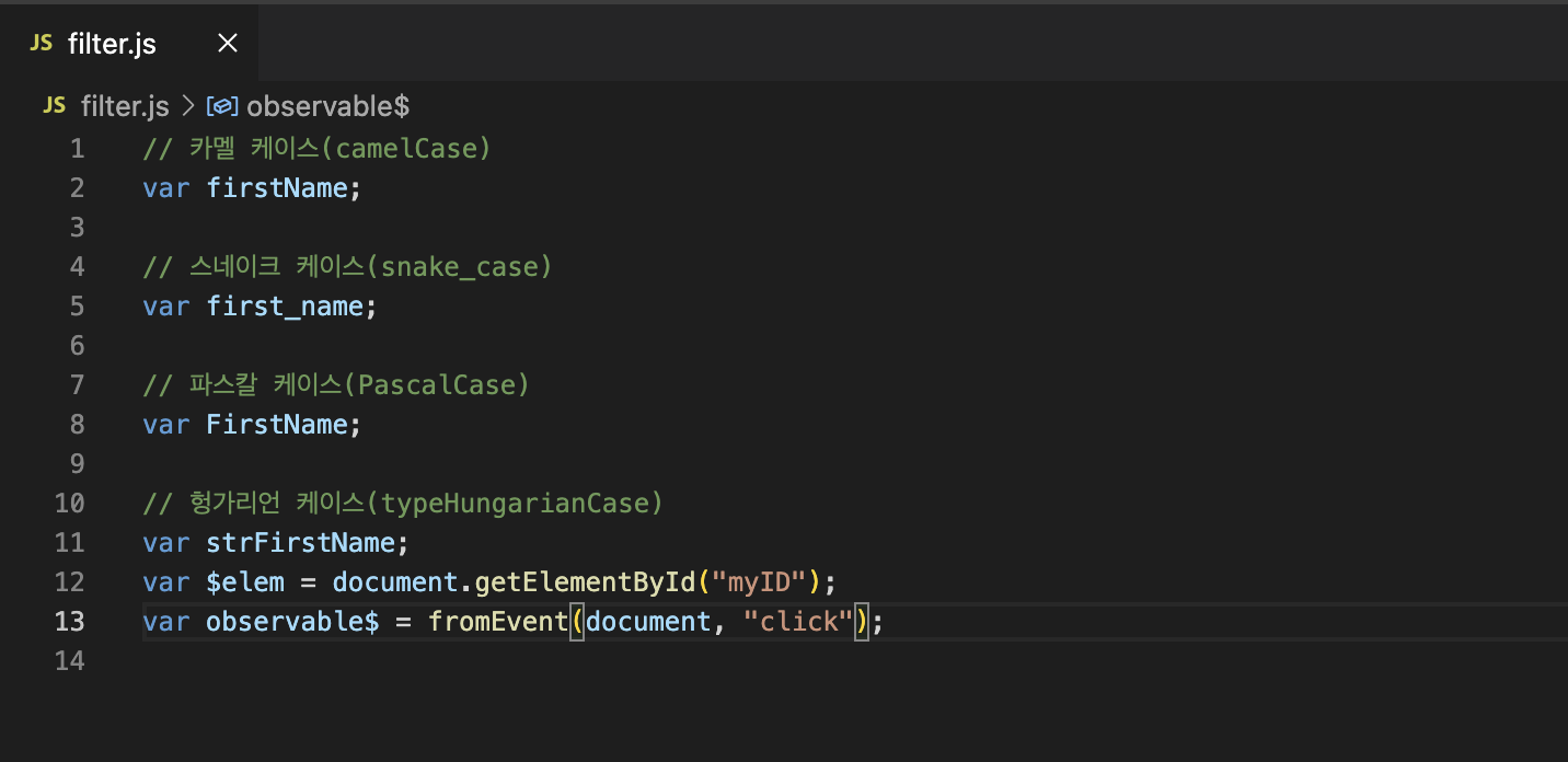 일반적으로 '변수 또는 함수'의 이름에는 카멜 케이스를 적용하고, '생성자 함수 또는 클래스' 이름에는 파스칼 케이스를 적용한다고 한다.