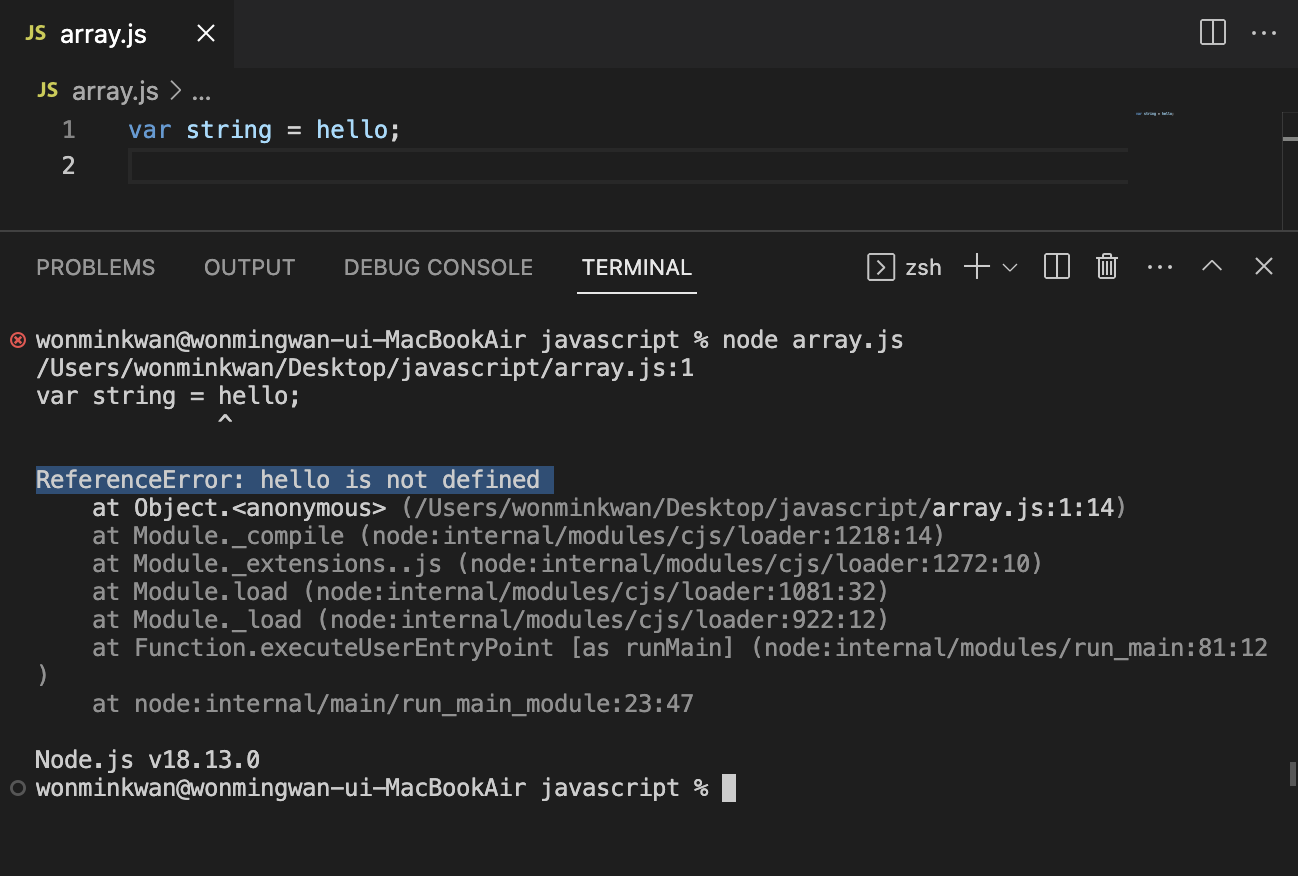 'hello'를 따옴표로 감싸지 않으니까, Reference Error가 등장했다. 정말 식별자로 인식한다는 점을 확인할 수 있다.