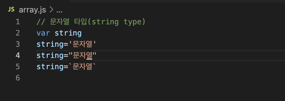 문자열은 ``작은따옴표(''), 큰따옴표(""), 또는 백틱()``으로 텍스트를 감싼다.