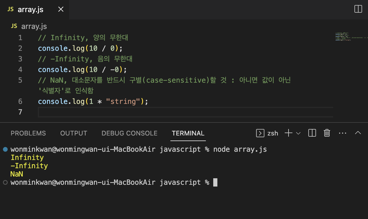 어쨌든 JS에서는 모든 수를 실수로 처리하며, 정수만을 표현하기 위한 데이터 타입은 별도로 존재하지 않는다는 것이 결론이다. 숫자 타입 part 초입에, 자바스크립트는 '하나의 숫자 타입(실수)'만 존재한다고 언급한 것이 바로 위 결론에 해당된다.