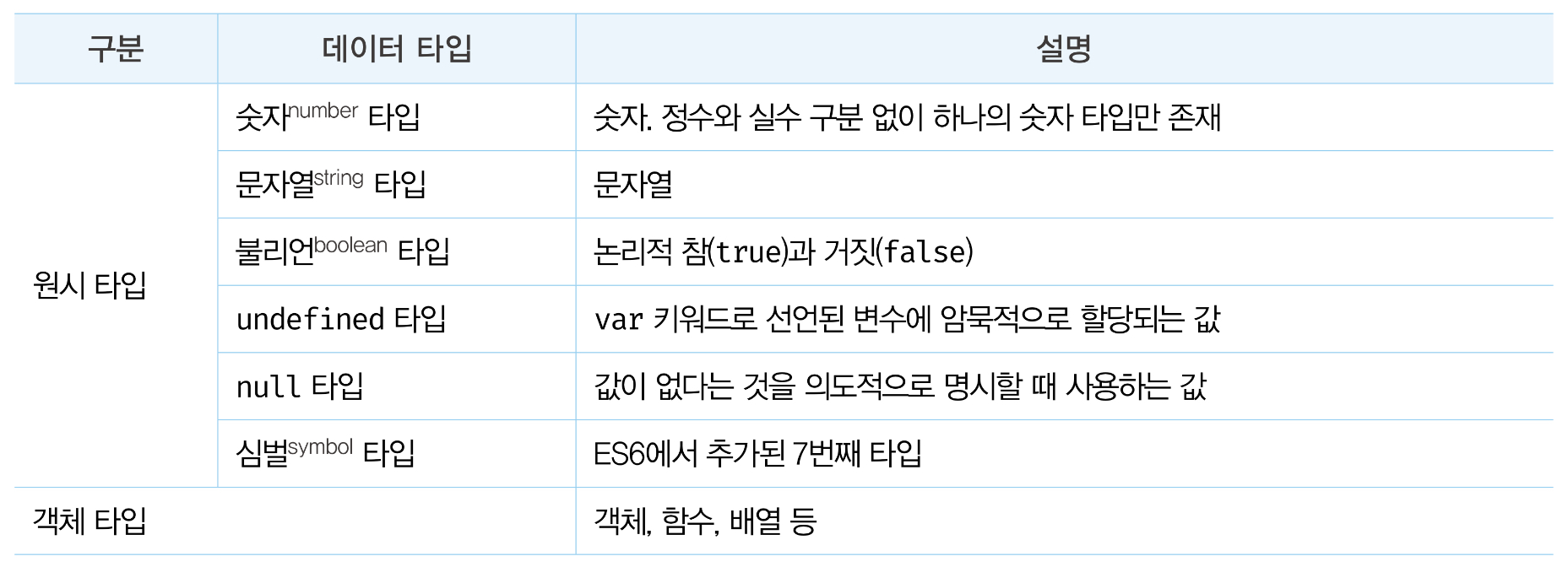데이터 타입(data type)은 말 그대로 값의 종류를 말한다. JS의 모든 값은 데이터 타입을 갖는다. 자바스크립트(ES6)는 7개의 데이터 타입을 제공한다. 7개의 데이터 타입은 ``원시 타입(primitive type)`과 `객체 타입(object/reference type)``으로 분류할 수 있다.