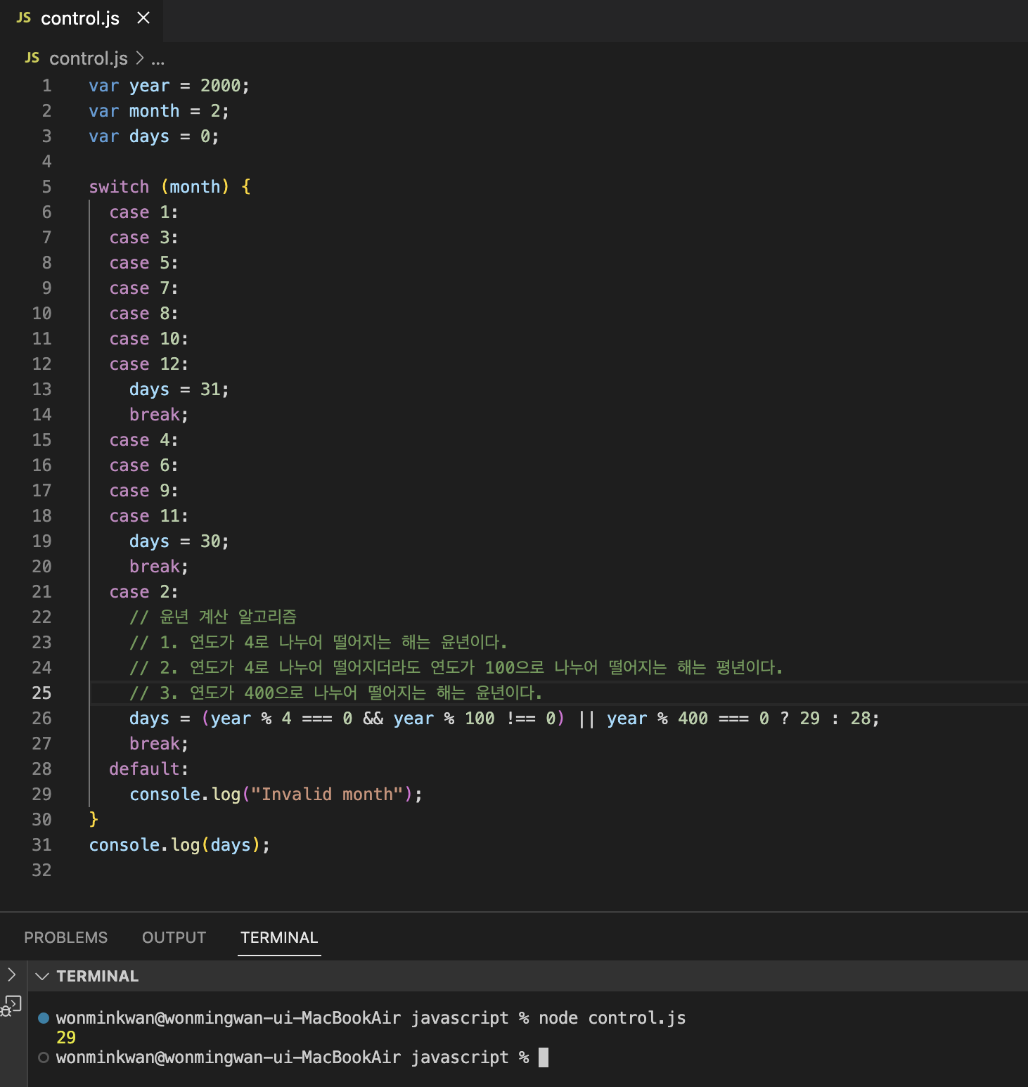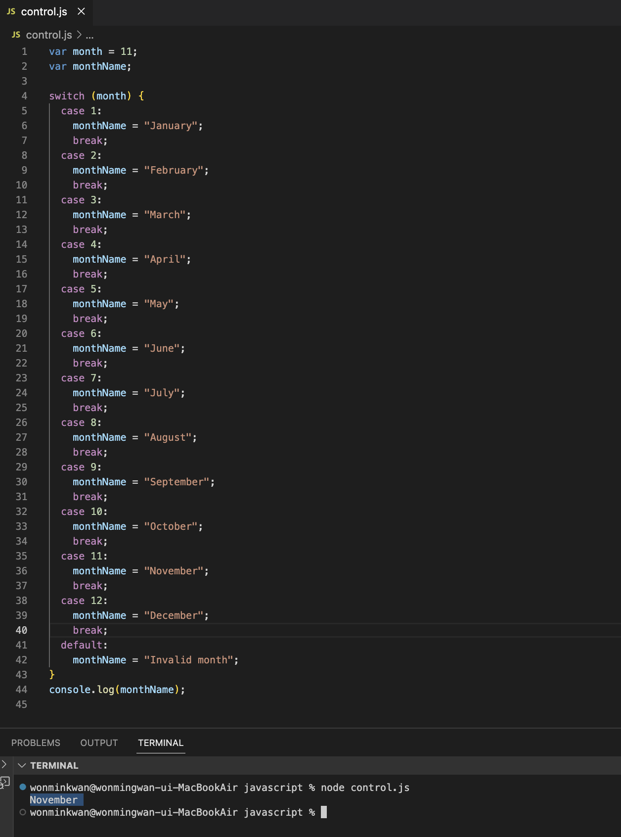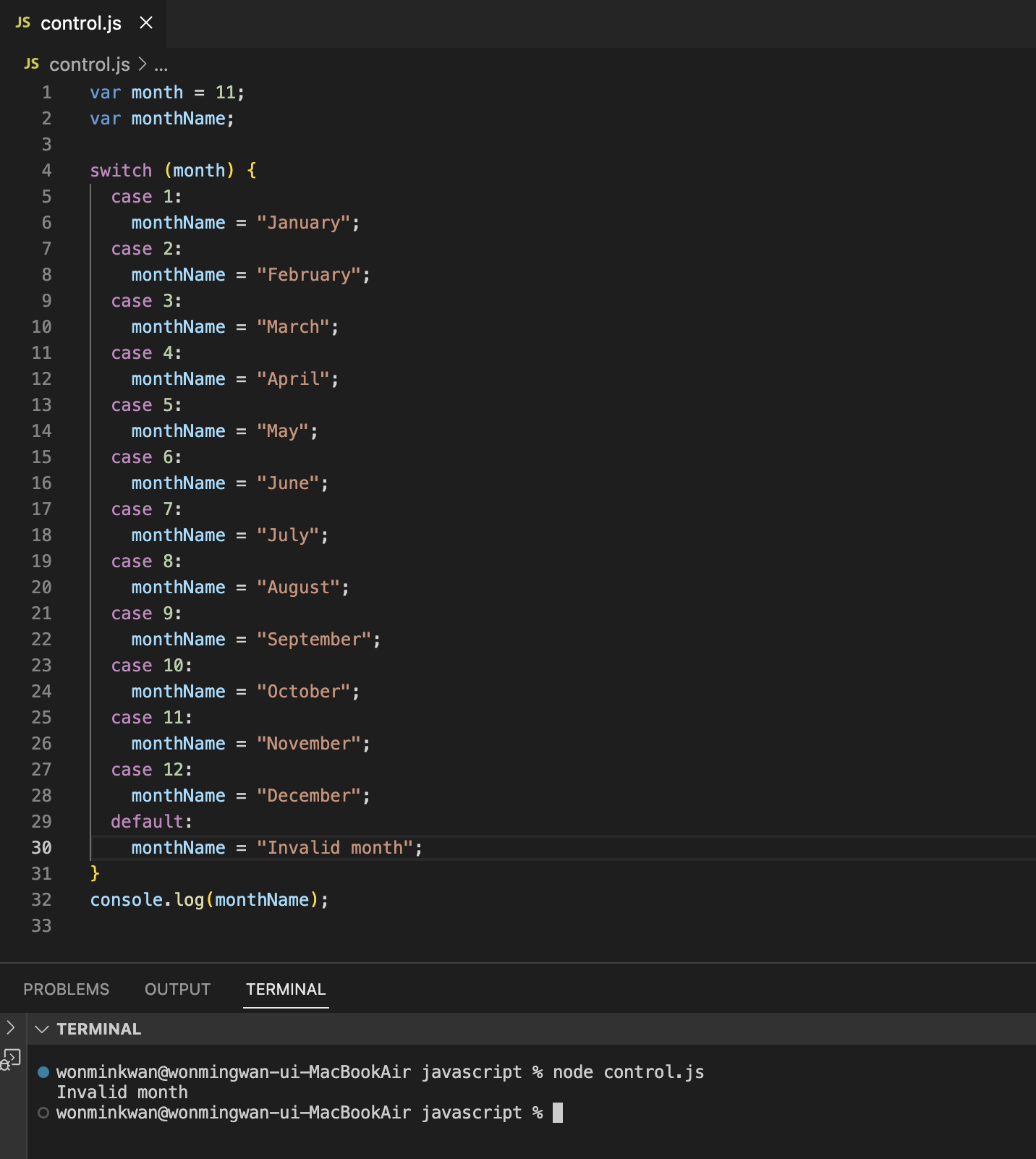 November를 의도하고 작성한 코드인데 'Invalid month'가 출력되었다. 조건에 맞을 때 break를 걸어주지 않으면 switch 문이 끝날 때까지 이후의 모든 case 문과 default 문을 실행하게 된다. 이러한 현상을 ``fall through``라고 한다.