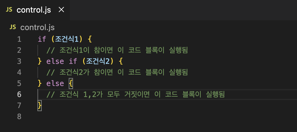 조건식을 평가했을 때, 그 결과가 ``true`이면 `if 문의 코드 블록이 실행`되고, `false`이면 `else 문의 코드 블록이 실행`된다. 조건식은 불리언 값으로 평가되어야 하는데, 만일 if 문의 조건식이 `불리언 값이 아닌 값`으로 평가되면 자바스크립트 엔진에 의해 `암묵적으로 불리언 값으로 강제 변환``된다고 한다. 암묵적 타입 변환에 대해서는 차후에 깊게 배우도록 하겠다.