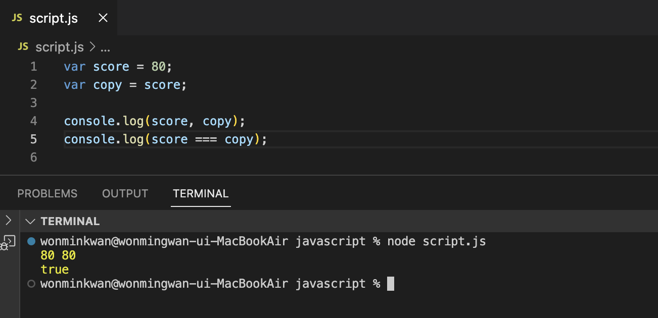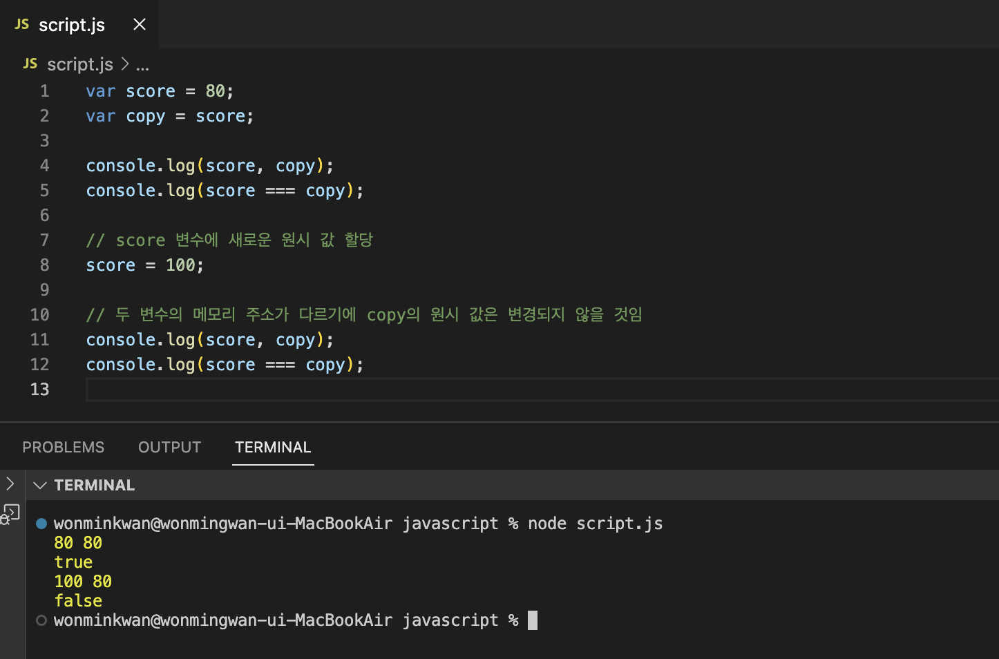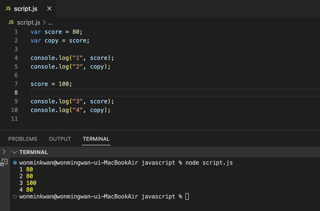 숫자 값 80을 갖는다는 점에서는 두 변수(score, copy)가 동일하다. 그러나 score 변수와 copy 변수의 값 80은 다른 메모리 공간에 저장된 ``별개의 값``이다. 증거는 다음과 같다.