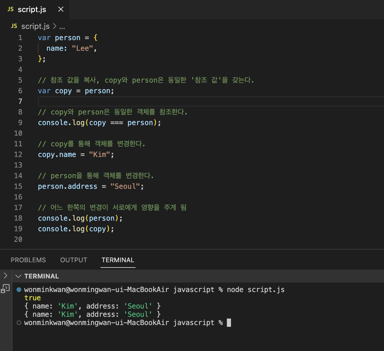치명적인 부작용이 하나 있는데, 원시 값과는 다르게 여러 개의 식별자가 하나의 객체를 공유할 수 있다는 점이다.