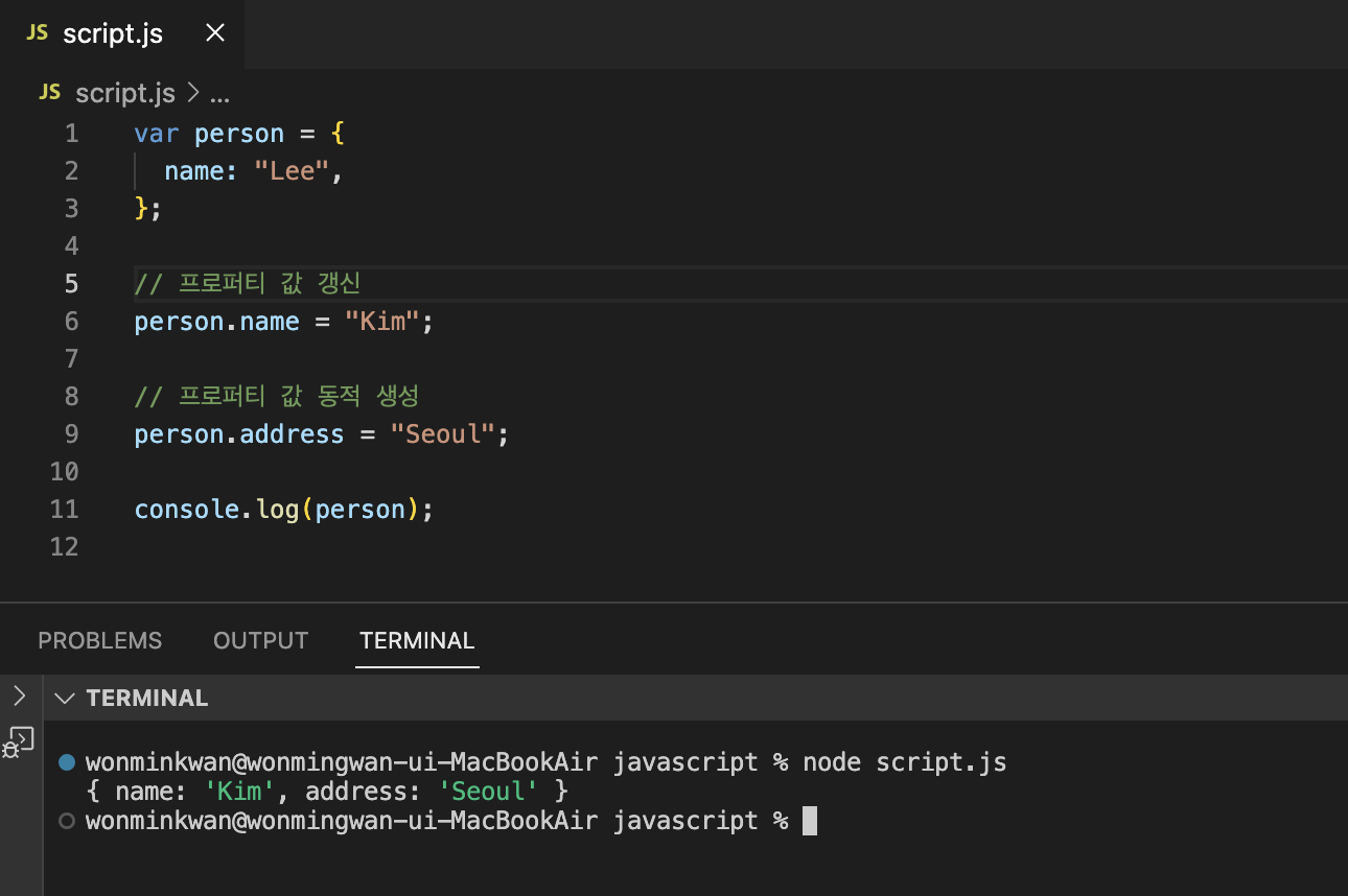 변수에 다음과 같은 객체를 할당한 상황이라고 가정하자.