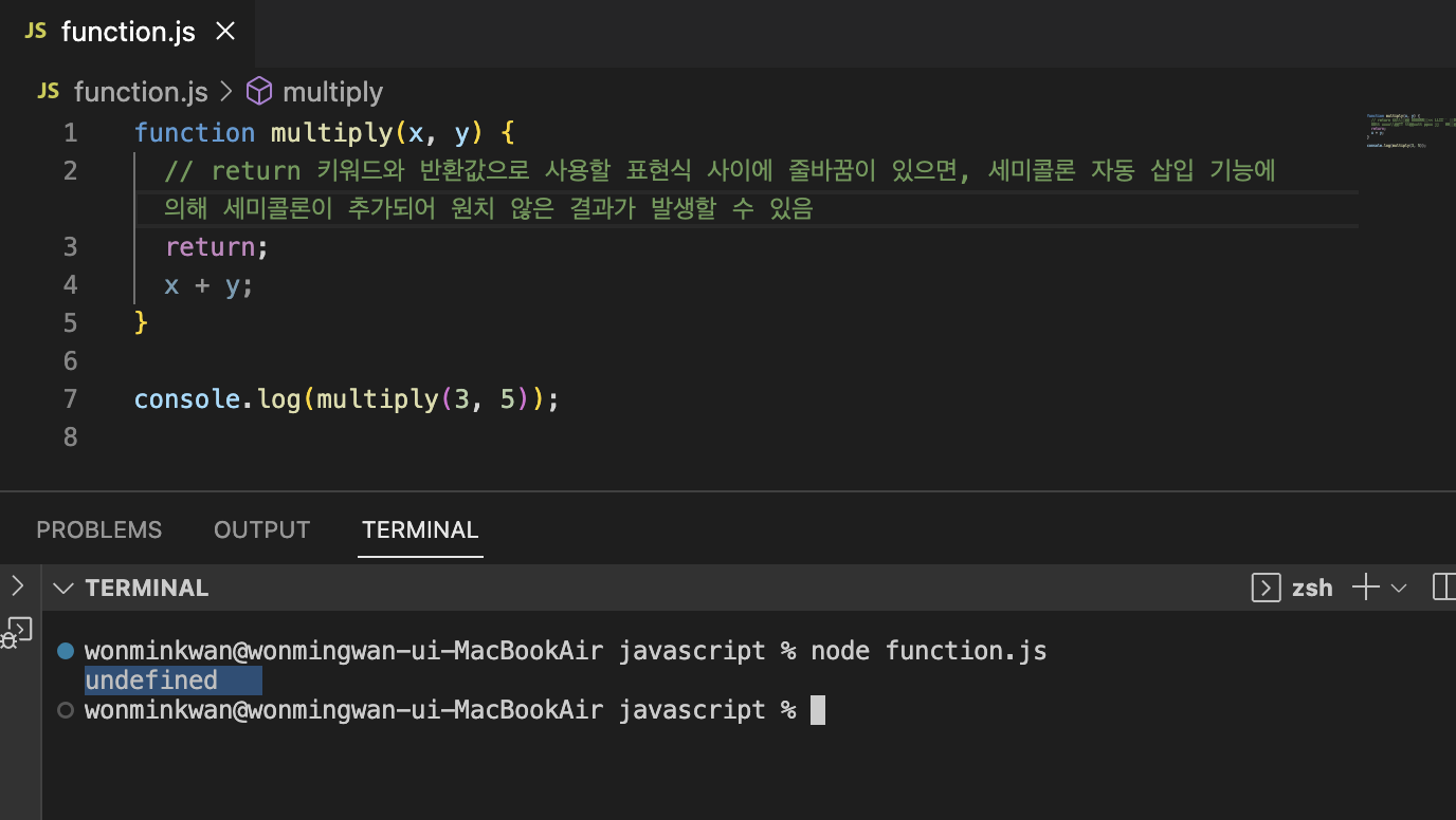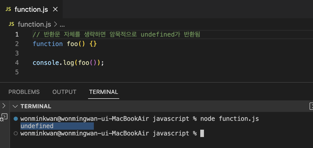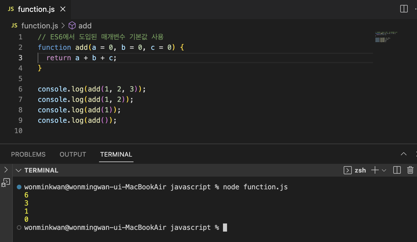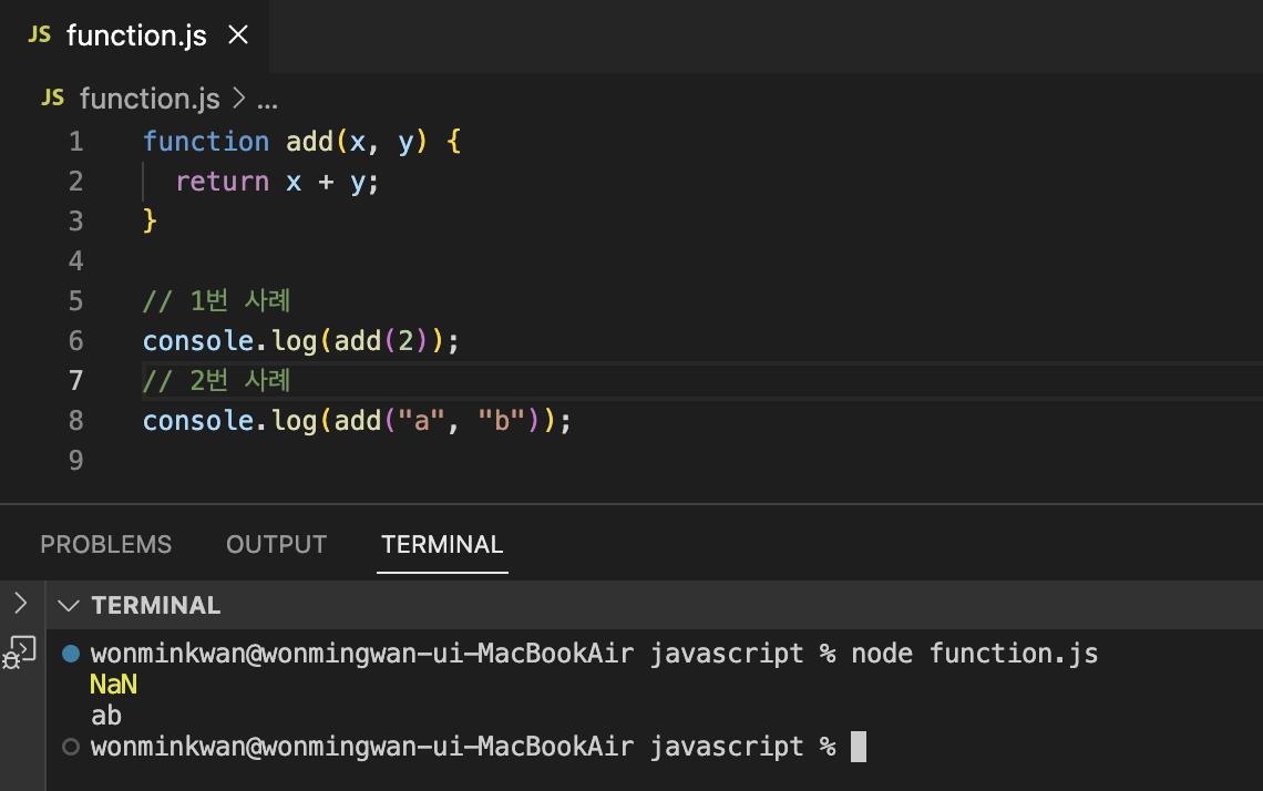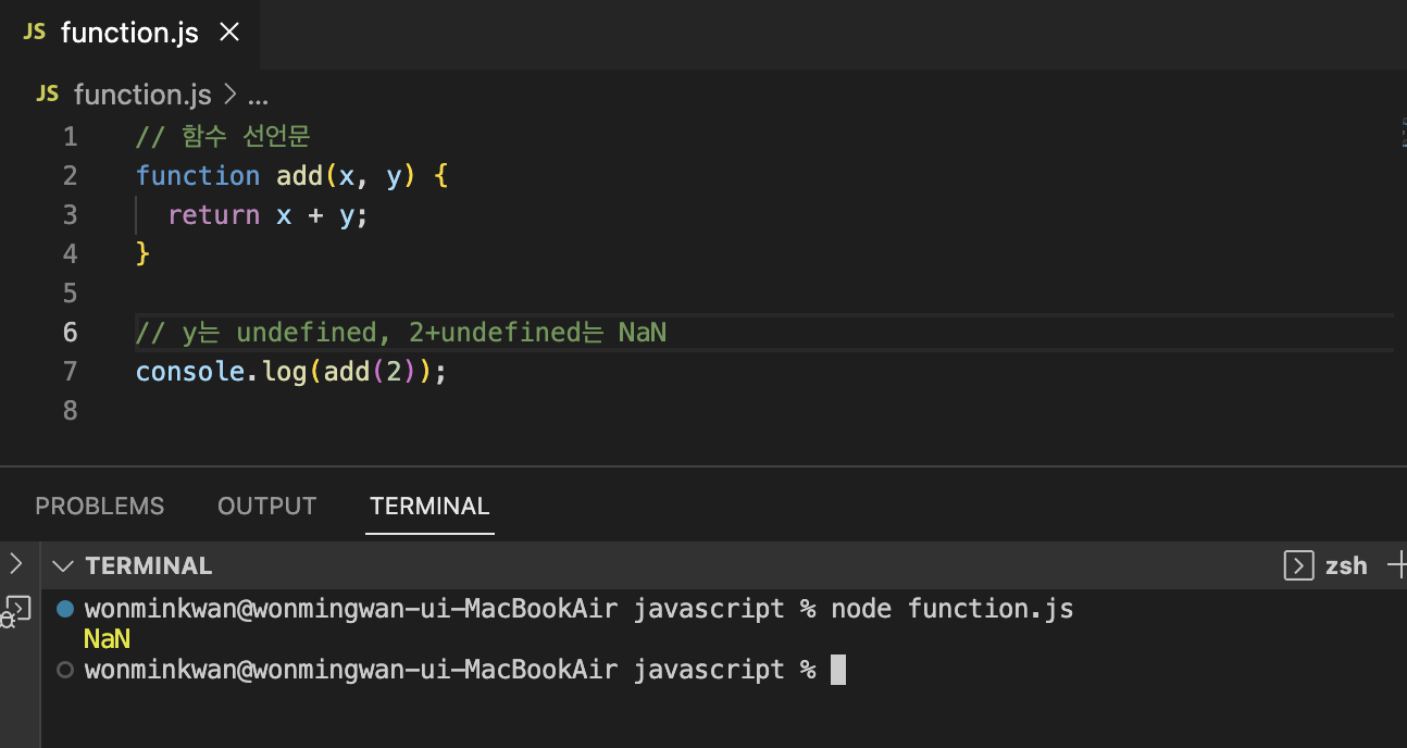 함수를 호출할 때 매개변수의 개수만큼 인수를 전달하는 것이 일반적이지만, 그렇지 않은 경우에도 에러는 발생하지 않는다. 인수가 부족해서 인수가 할당되지 않은 매개변수의 값은 undefined다.