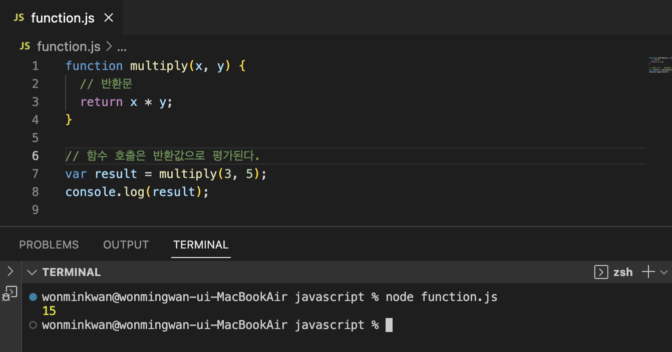 함수는 'return 키워드와 표현식(반환값)'으로 이루어진 반환문을 사용해, 실행 결과를 한수 외부로 반환(return)할 수 있다.