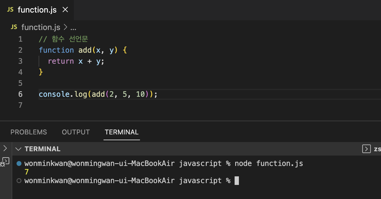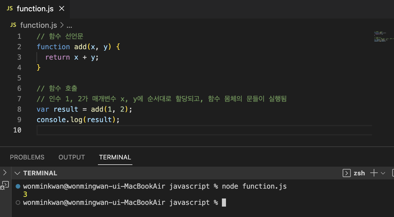 매개변수와 인수함수를 실행하기 위해 필요한 값을, 함수 외부에서 함수 내부로 전달할 필요가 있는 경우, 매개변수(parameter)를 통해 인수(argumnet)를 전달한다. 인수(argument)는 함수를 호출할 때 지정하며, 개수와 타입에는 제한이 없다.매개변수(p