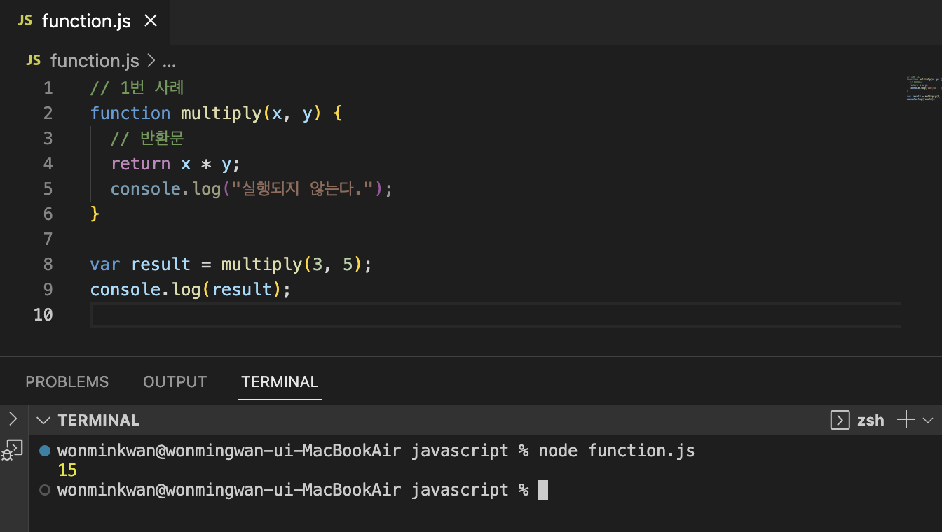 1. 함수의 실행을 중단하고 함수 몸체를 빠져나간다. 반환문 이후에 다른 문이 존재하면 그 문은 실행되지 않고 무시된다. 2. 반환문은 return 키워드 뒤에 오는 표현식을 평가해 반환한다. return 키워드 뒤에 반환값으로 사용할 표현식을 명시적으로 지정하지 않으면 undefined가 반환된다.