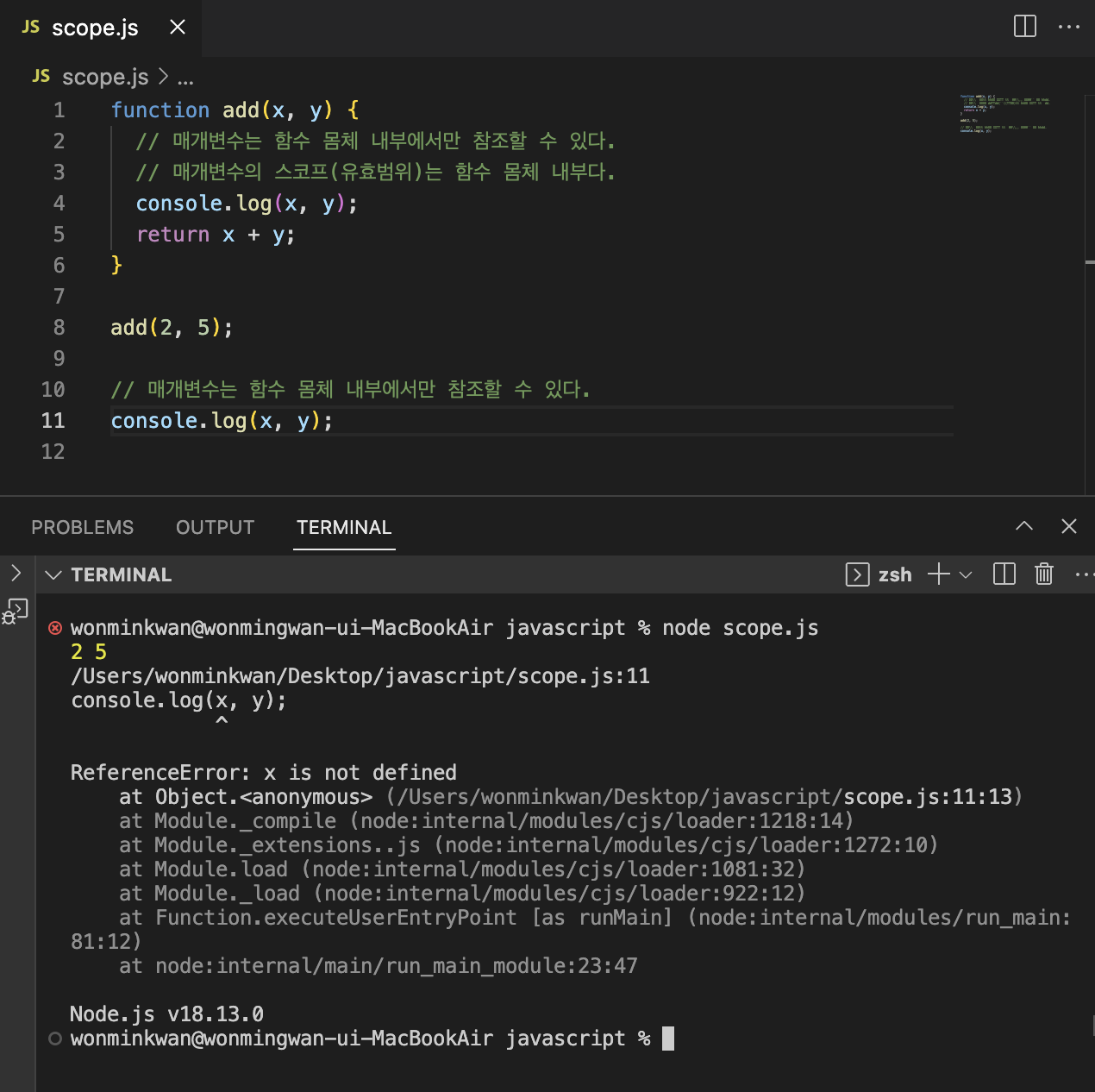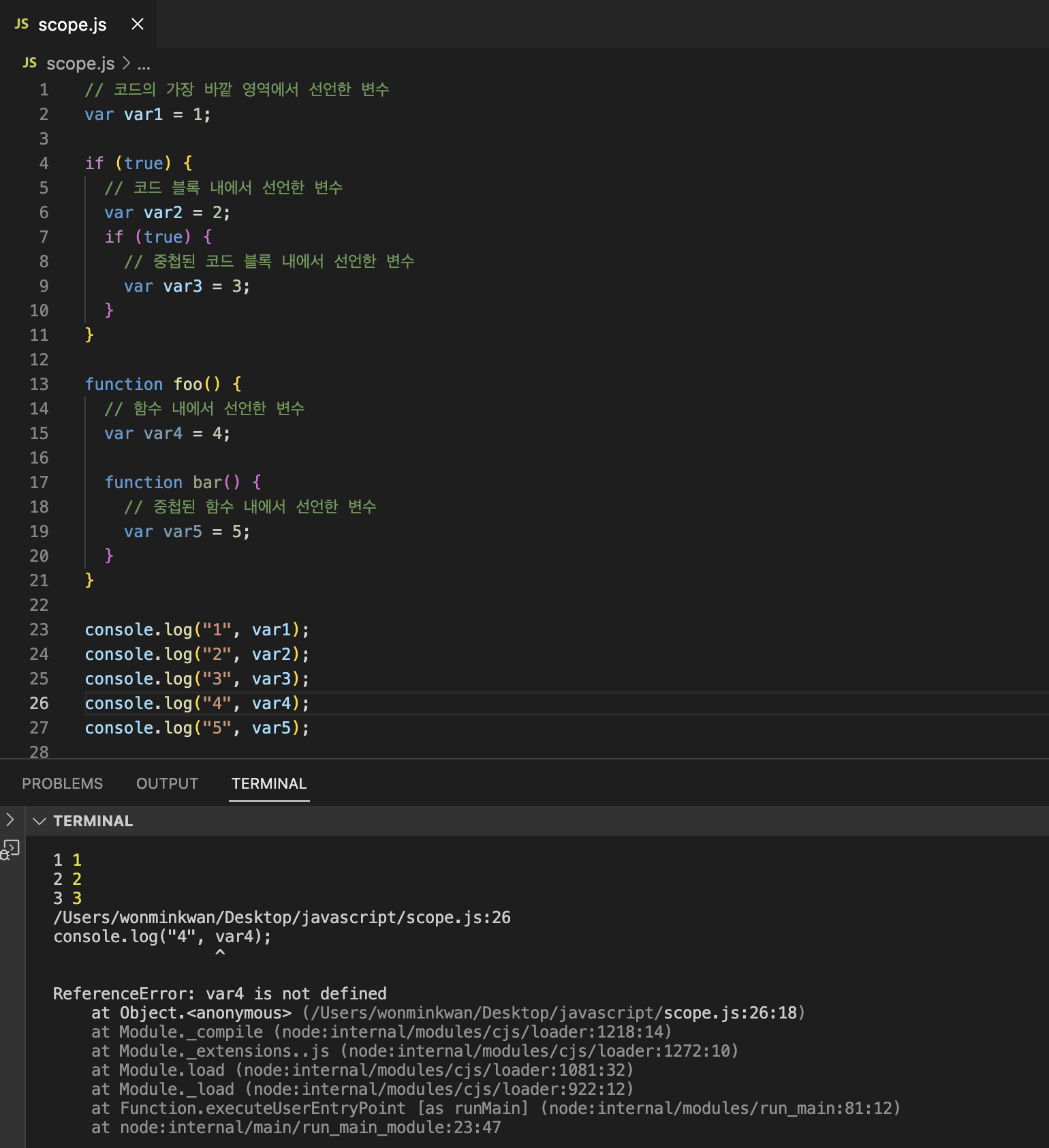스코프(유효범위)는 자바스크립트를 포함한 모든 프로그래밍 언어의 기본적이며 중요한 개념이다. 다음 코드를 살펴보자.
