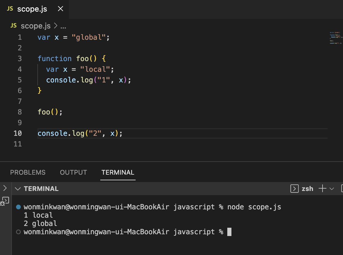 위 예제에서, 코드 가장 바깥 영역에 선언된 x 변수는 어디서든 참조가 가능하다. 하지만 foo 함수 내부에서 선언된 x 변수는 foo 함수 내부에서만 참조할 수 있고 foo 함수 외부에서는 참조할 수 없다. 두 개의 x 변수는, 이름은 동일하지만 스코프가 다른 별개의 변수이다.