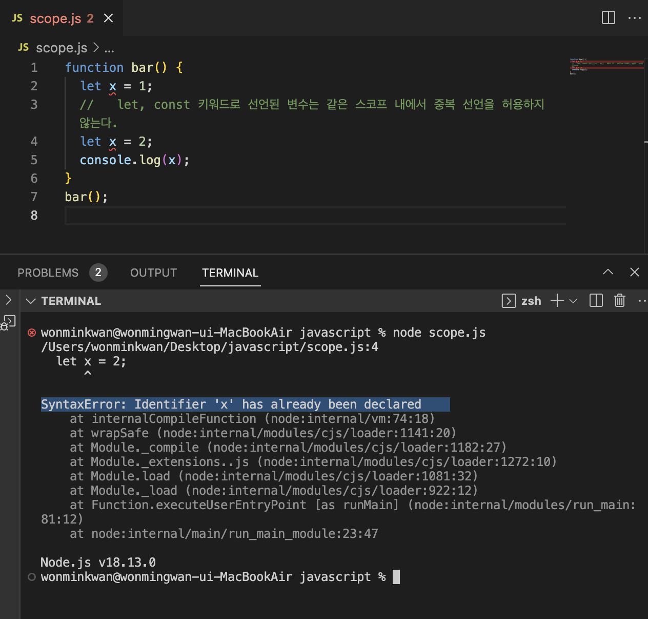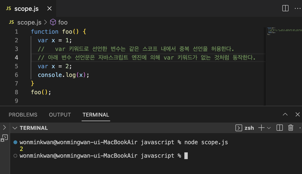 +) var 키워드로 선언된 변수는 같은 스코프 내에서 중복 선언이 허용된다.