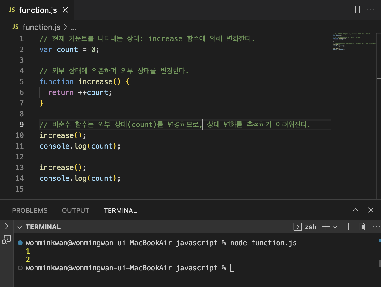 함수가 외부 상태를 변경하면 상태 변화를 추적하기 어려워진다. 따라서 함수 외부 상태의 변경을 지양하는 순수 함수를 사용하는 것이 좋다. 위 예제의 increase 함수와 같은 비순수 함수는 코드의 복잡성을 증가시킨다. 비순수 함수를 최대한 줄이는 것은 부수 효과를 최대한 억제하는 것과 같다.