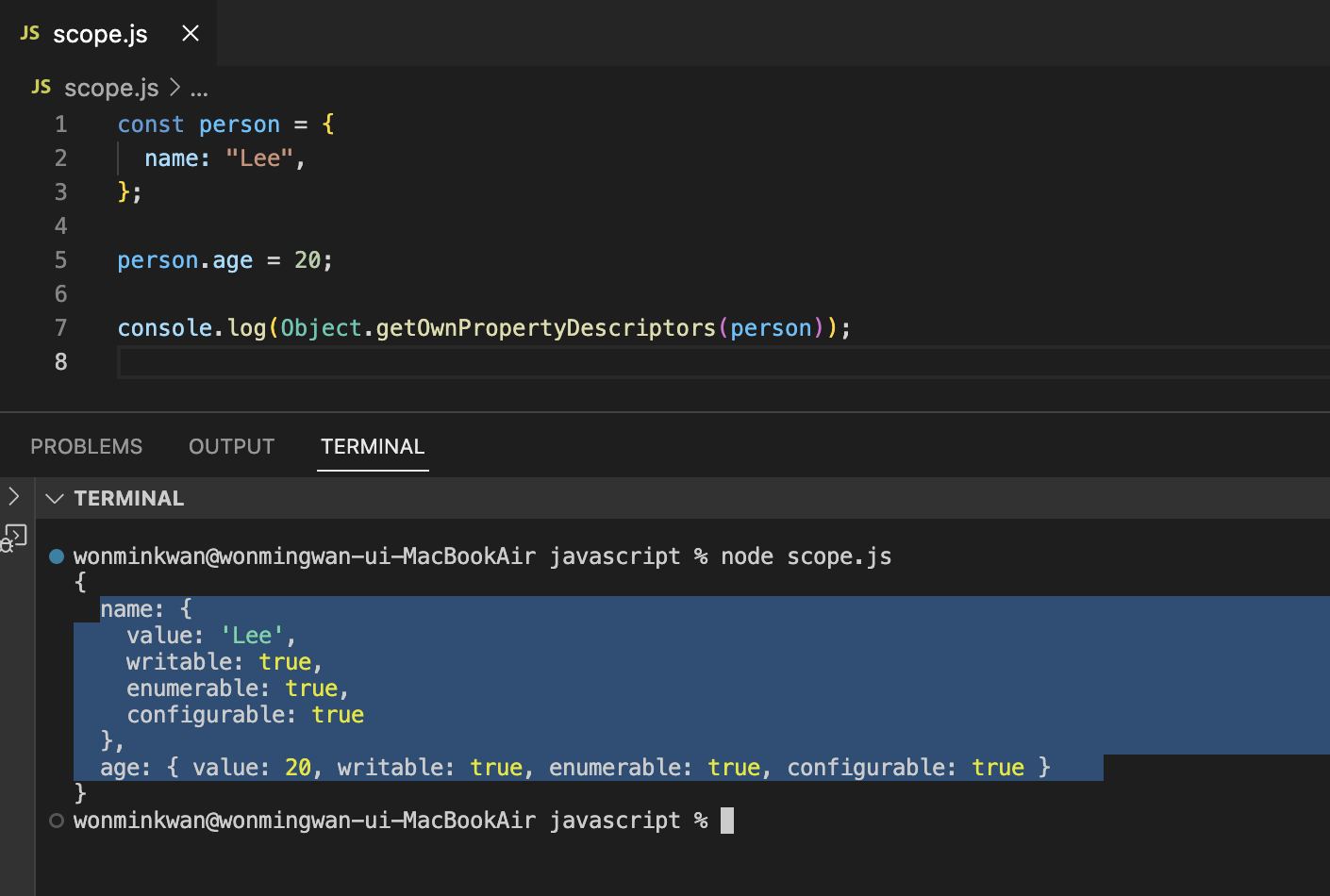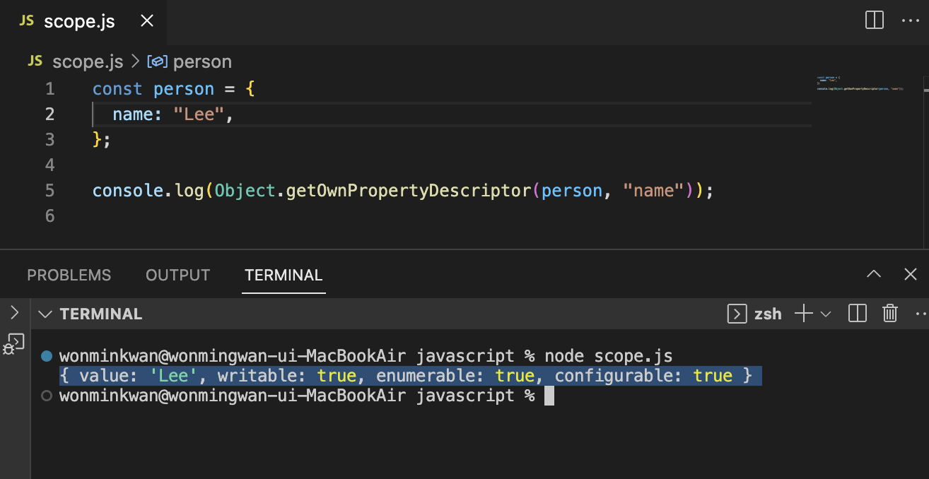 '프로퍼티(key:value)'를 생성하면 기본 세팅값으로 '프로퍼티 어트리뷰트'가 자동으로 정의된다. 프로퍼티 어트리뷰트에 직접 접근할 수는 없고 discriptor 메서드를 통해 간접적으로 확인할 수 있다.