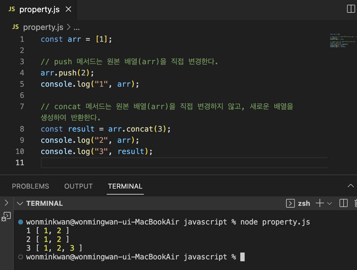 1. 원본 배열을 직접 변경하는 메서드 2. 원본 배열을 직접 변경하지 않고, 새로운 배열을 생성하여 반환하는 메서드