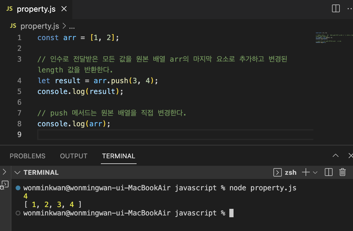 push 메서드는 인수로 전달받은 모든 값을 원본 배열의 마지막 요소로 추가하고, 변경된 'length 프로퍼티 값'을 '반환'한다. 이때, push 메서드는 원본 배열을 직접 변경한다.