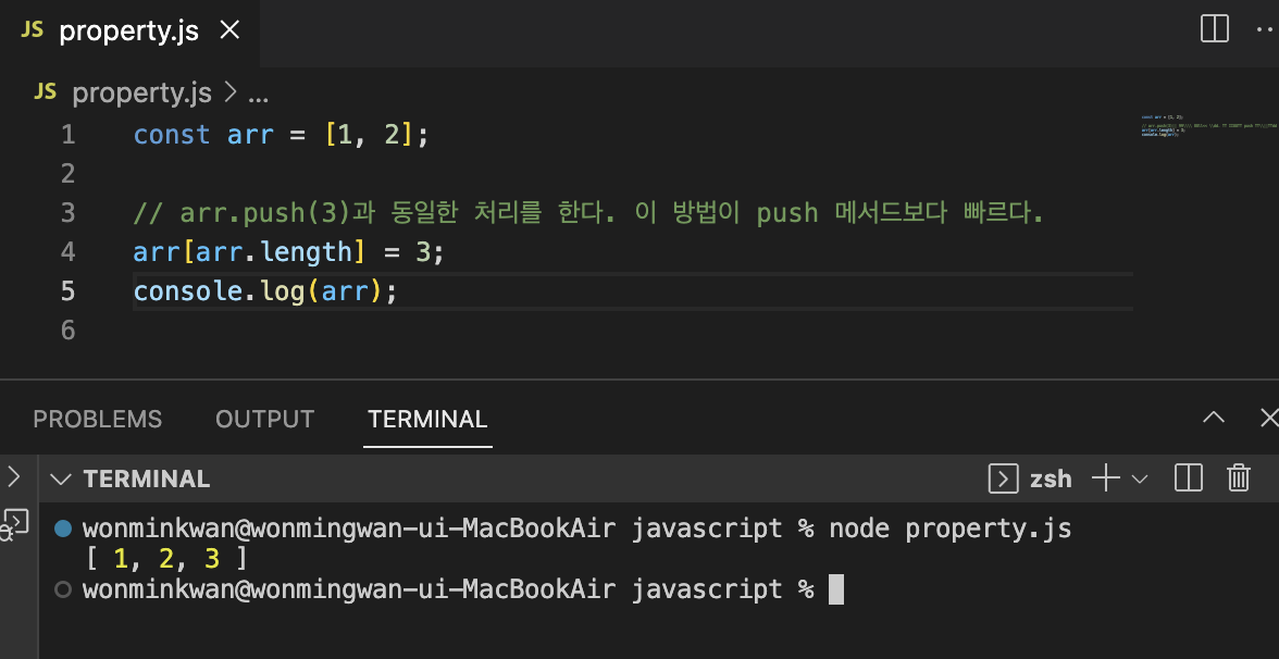 push 메서드는 성능 면에서 좋지 않다고 한다. 마지막으로 추가할 요소가 하나뿐이라면, push 메서드를 사용하지 않고 length 프로퍼티를 사용하여 배열의 마지막에 요소를 직접 추가할 수도 있다. 이 방법이 push 메서드보다 빠르다고 한다.