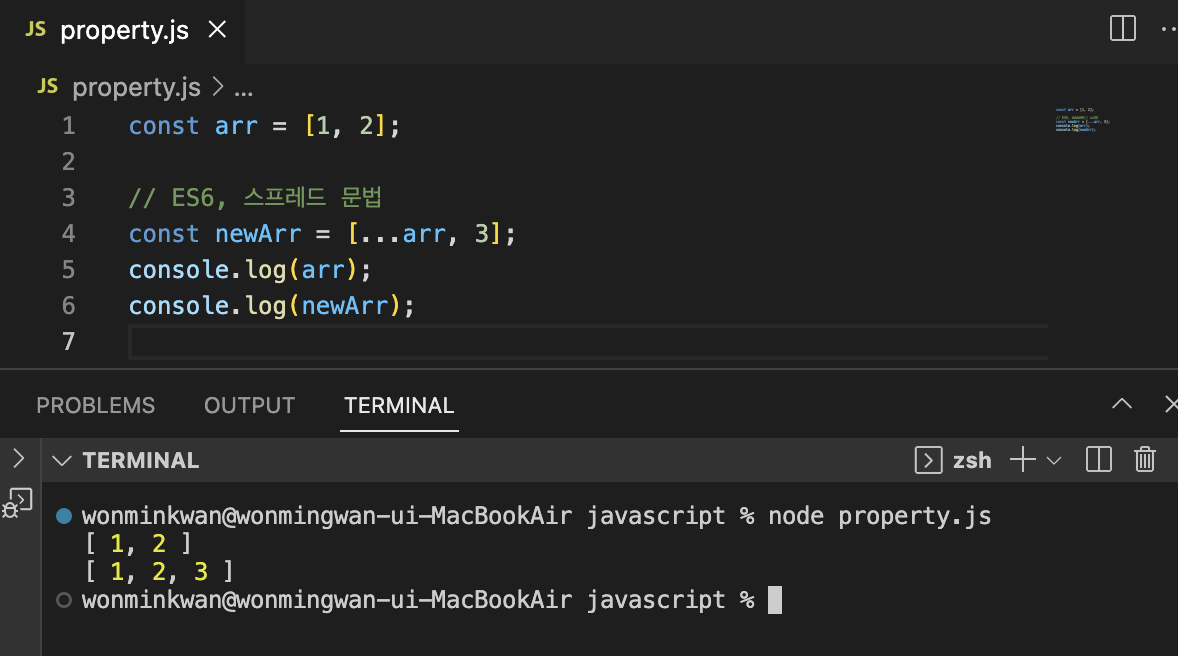 push 메서드는 원본 배열을 직접 변경하는 부수 효과가 있다. push의 본질이 '배열의 마지막에 요소를 추가'하는 것에 있다면, ES6의 스프레드 문법을 사용하는 편이 더 좋다.