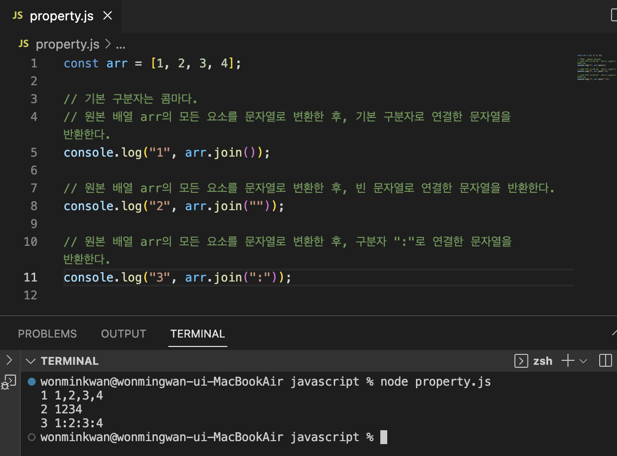 join 메서드는 원본 배열의 모든 요소를 ``문자열`로 변환한 후, `구분자(=인수로 전달받은 문자열)``로 연결한 문자열을 반환한다. 구분자는 생략 가능하며, 기본 구분자는 콤마(',')다. 예제 코드를 살펴봤다.