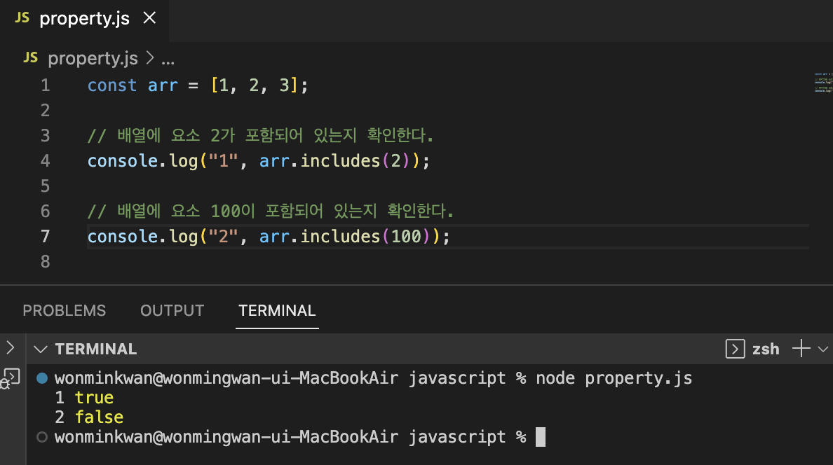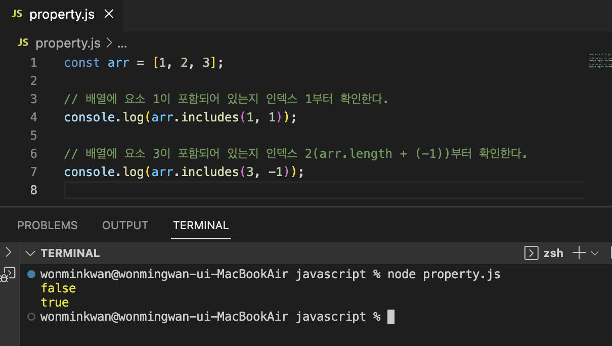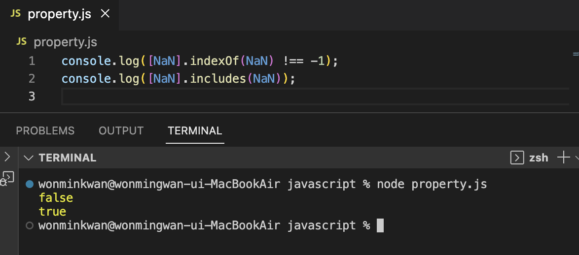 배열 내에 특정 요소가 포함되어 있는지를 확인하기 위해 indexOf 메서드를 활용할 수도 있다. 하지만 indexOf 메서드를 사용하면 반환값이 -1인지 확인해 보아야 하고, 배열에 NaN이 포함되어 있는지 확인할 수 없다는 문제가 있다.