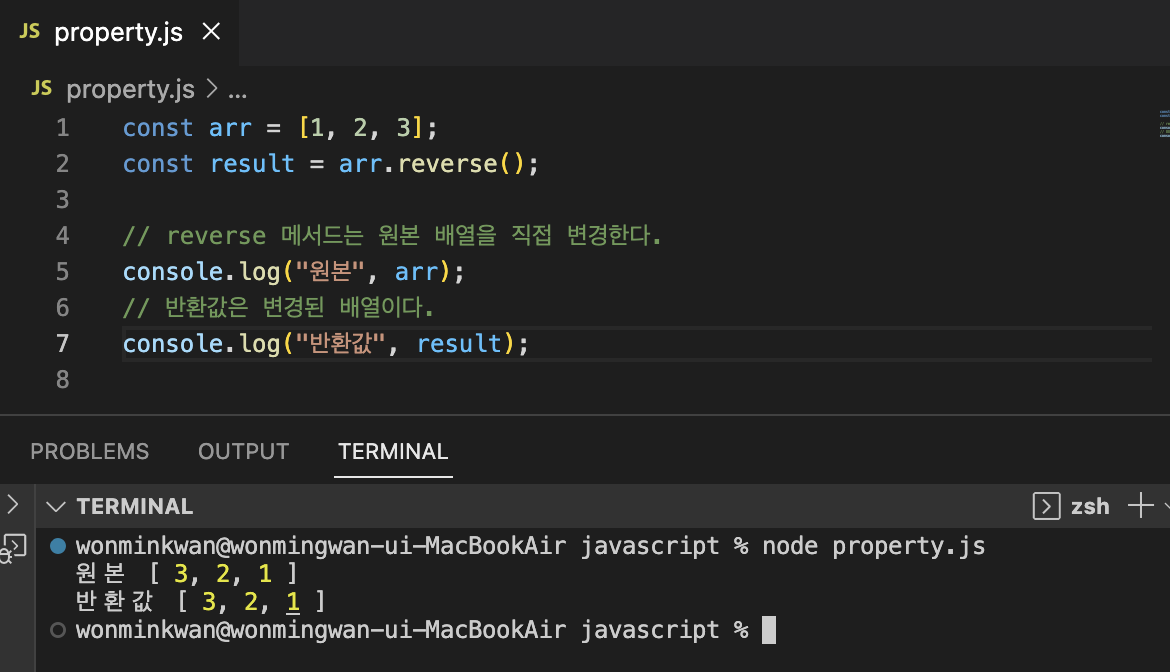 reverse 메서드는 원본 배열의 순서를 반대로 뒤집는다. 원본 배열이 변경되며, 반환값은 변경된 배열이다.