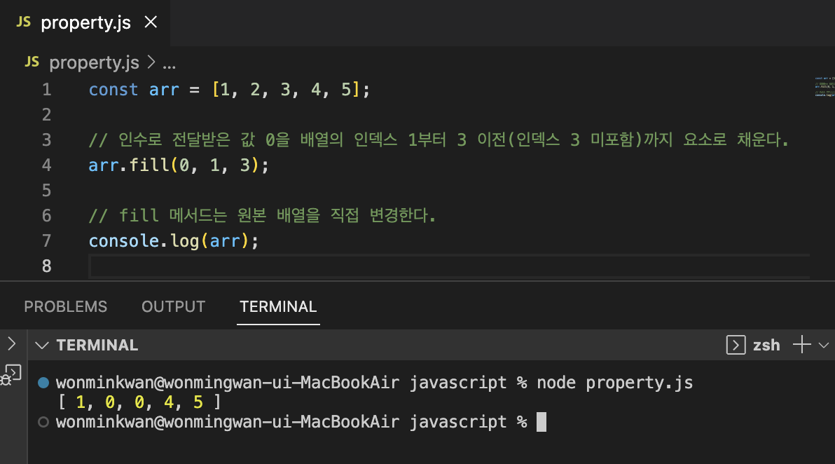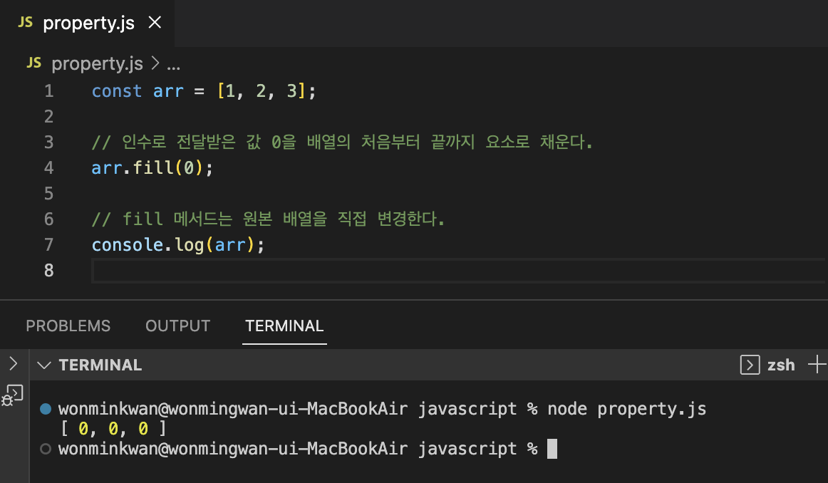 fill 메서드는 ES6에서 도입되었다. 인수로 전달받은 값을, 배열의 처음부터 끝까지 요소로 채운다. 이때 원본 배열이 변경된다.