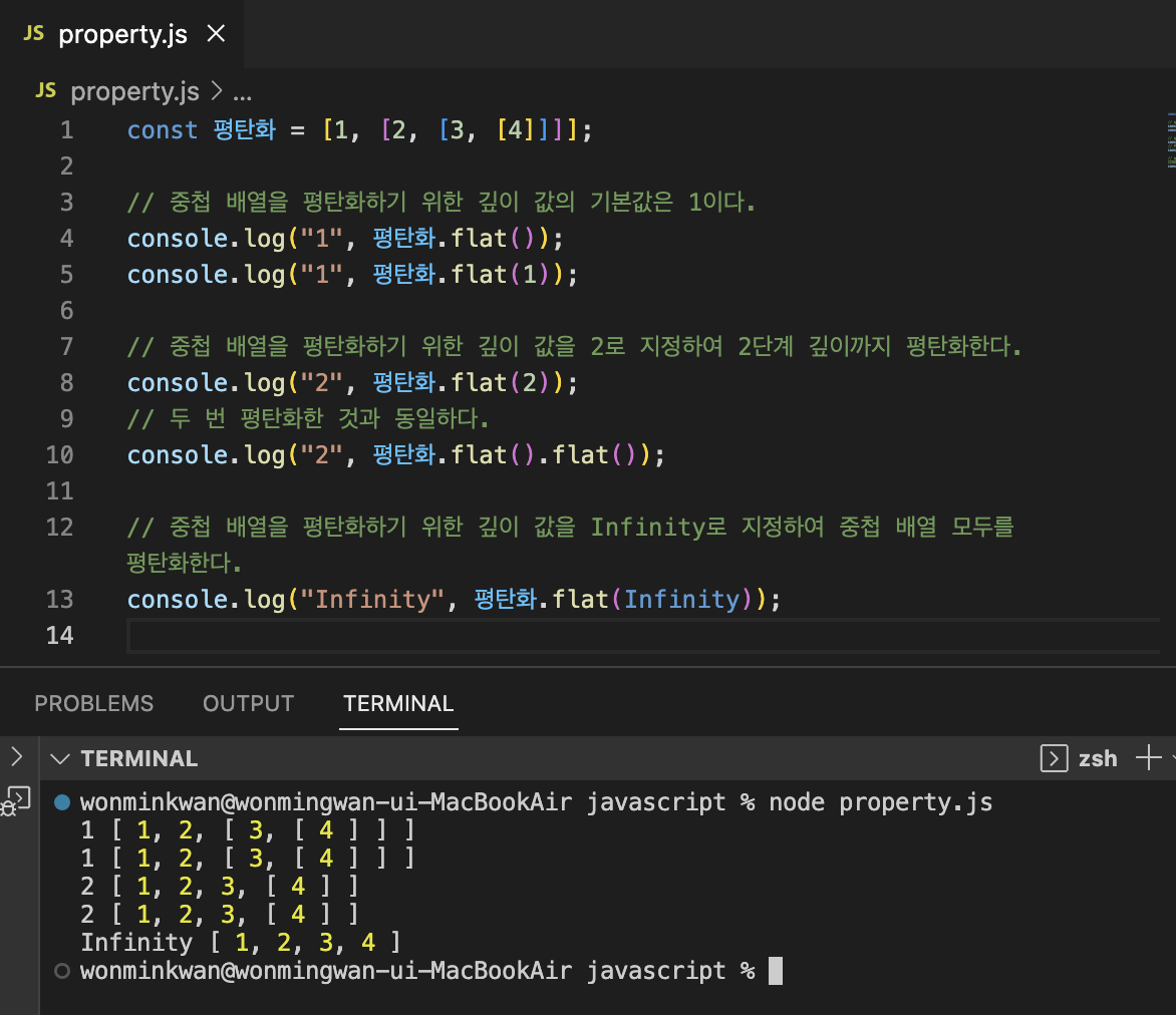 중첩 배열을 평탄화할 깊이를 인수로 전달할 수 있다. 인수를 생략할 경우 기본값은 1이다. 인수로 Infinity를 전달하면 중첩 배열 모두를 평탄화한다.
