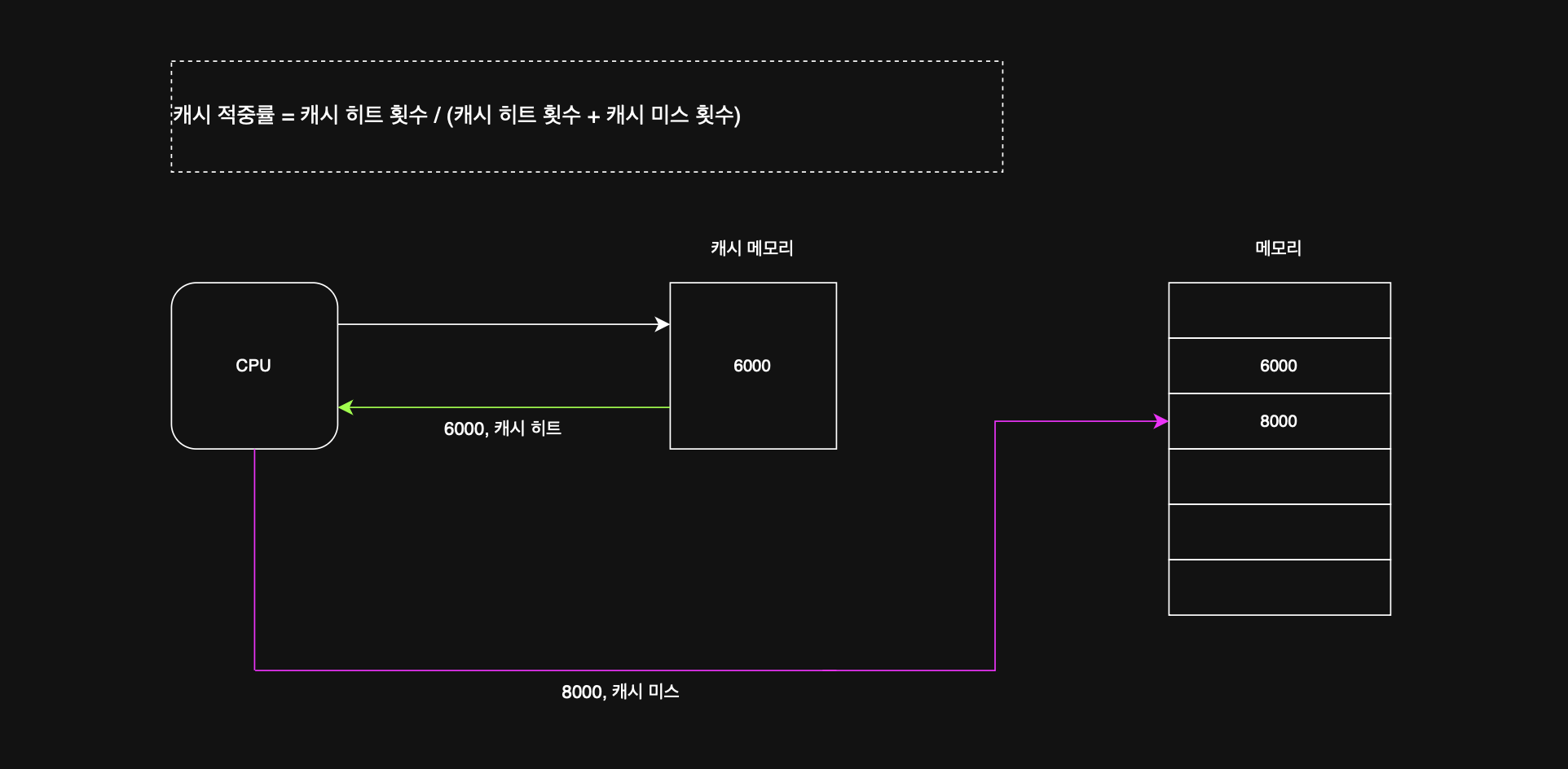 캐시 메모리로, 메모리에 있는 모든 내용을 가져다 저장할 수는 없다. 그렇다면 ``캐시 메모리에 무엇을 저장해야 하는가``가 핵심이다. 캐시 메모리는 CPU가 사용할 법한 대상을 예측하여 저장한다. 이 예측이 맞는 경우를 캐시 히트, 틀리는 경우를 캐시 미스라고 부르고, 캐시가 히트되는 비율을 캐시 적중률이라고 부른다.