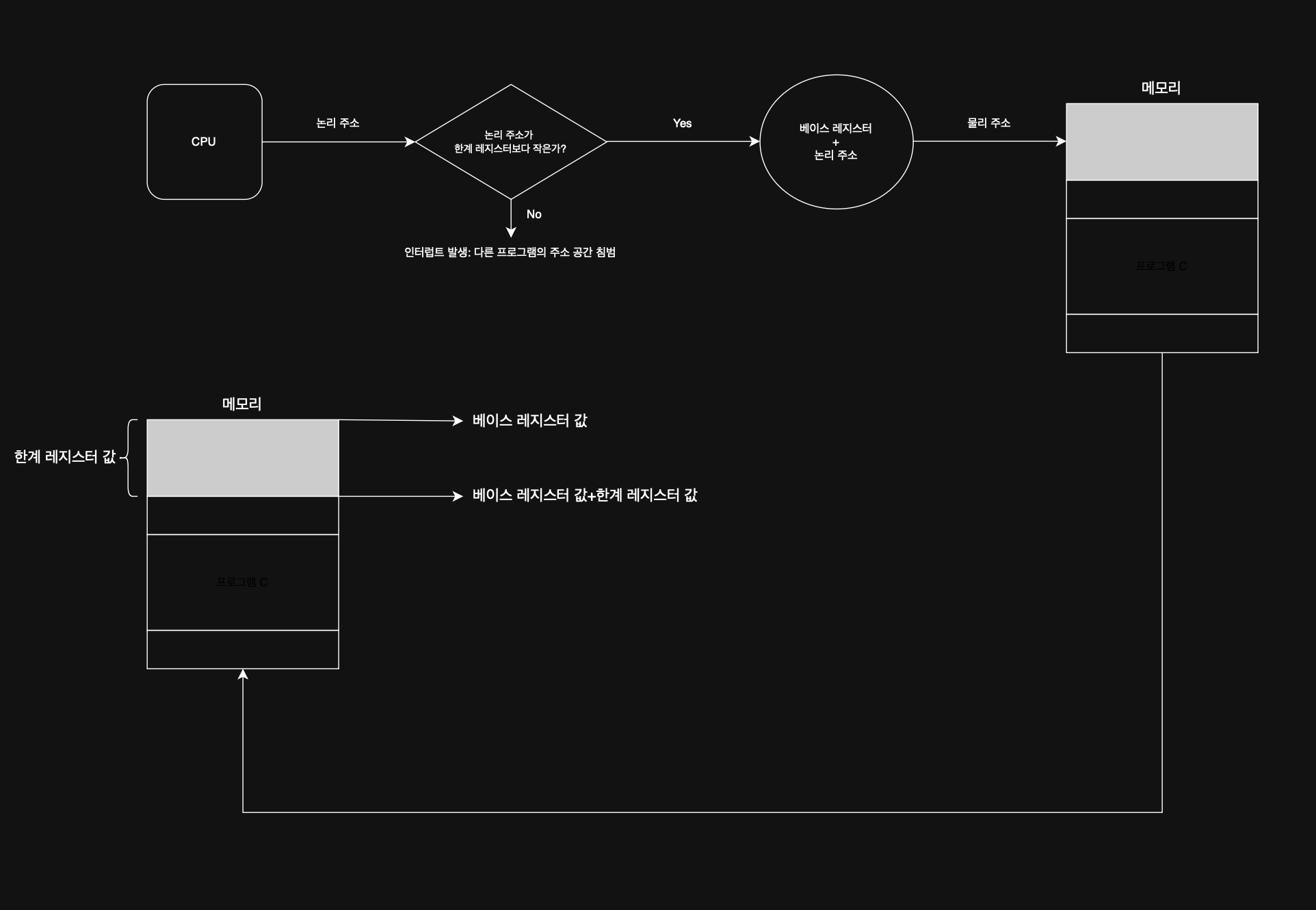 이처럼 논리 주소 범위를 벗어나는 명령어 실행을 방지하고, 실행 중인 프로그램이 다른 프로그램에 영향을 받지 않도록 보호할 방법이 필요할 것인데, 이를 한계 레지스터가 담당하게 된다. 말이 어려우니 그림으로 확인해 보자.
