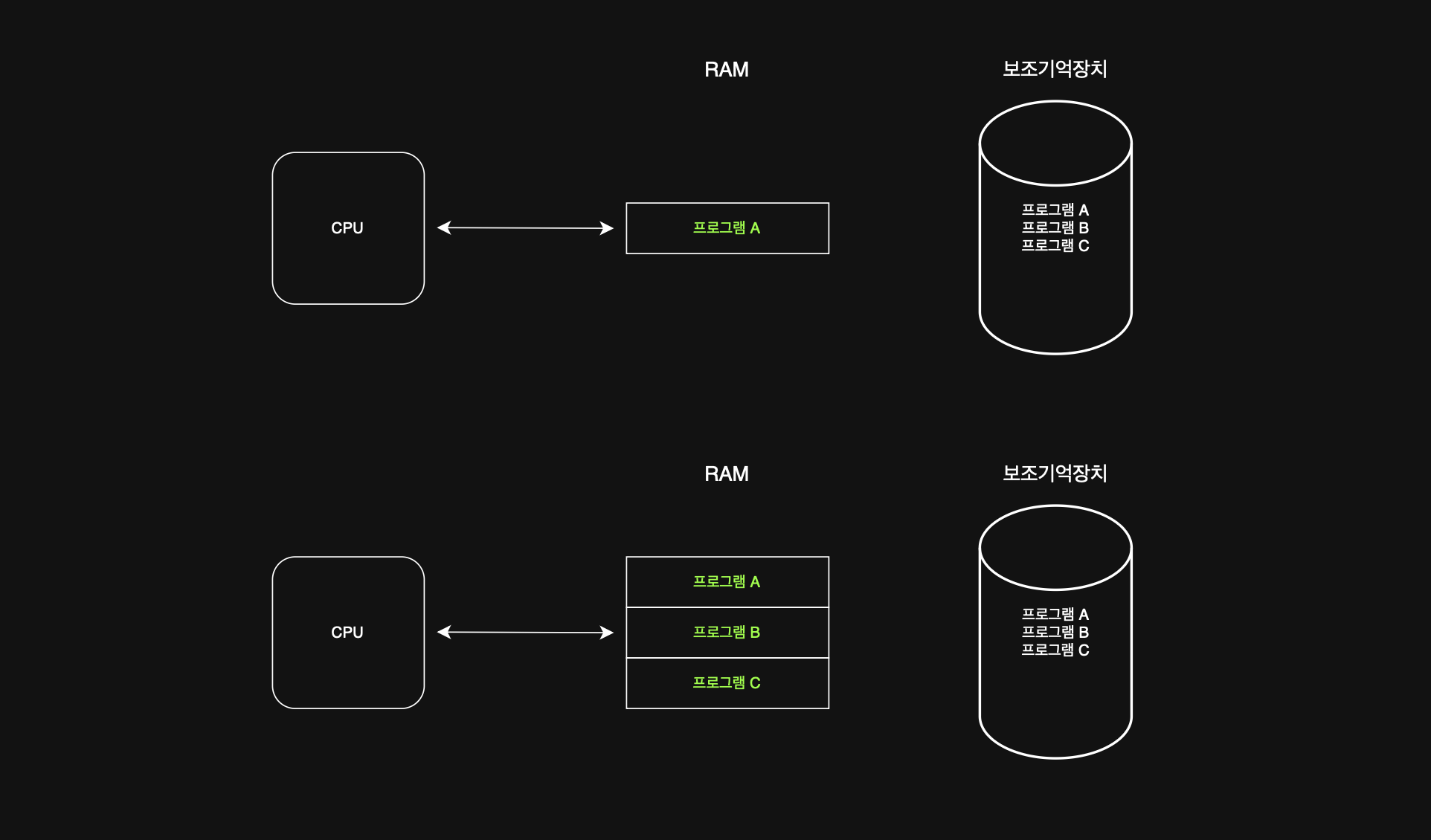 CPU는 보조기억장치에 직접 접근하지 못한다. 따라서 CPU가 실행 하고 싶은 프로그램이 보조기억장치에 있다면, 이를 RAM에 복사하여 저장한 뒤 실행한다.