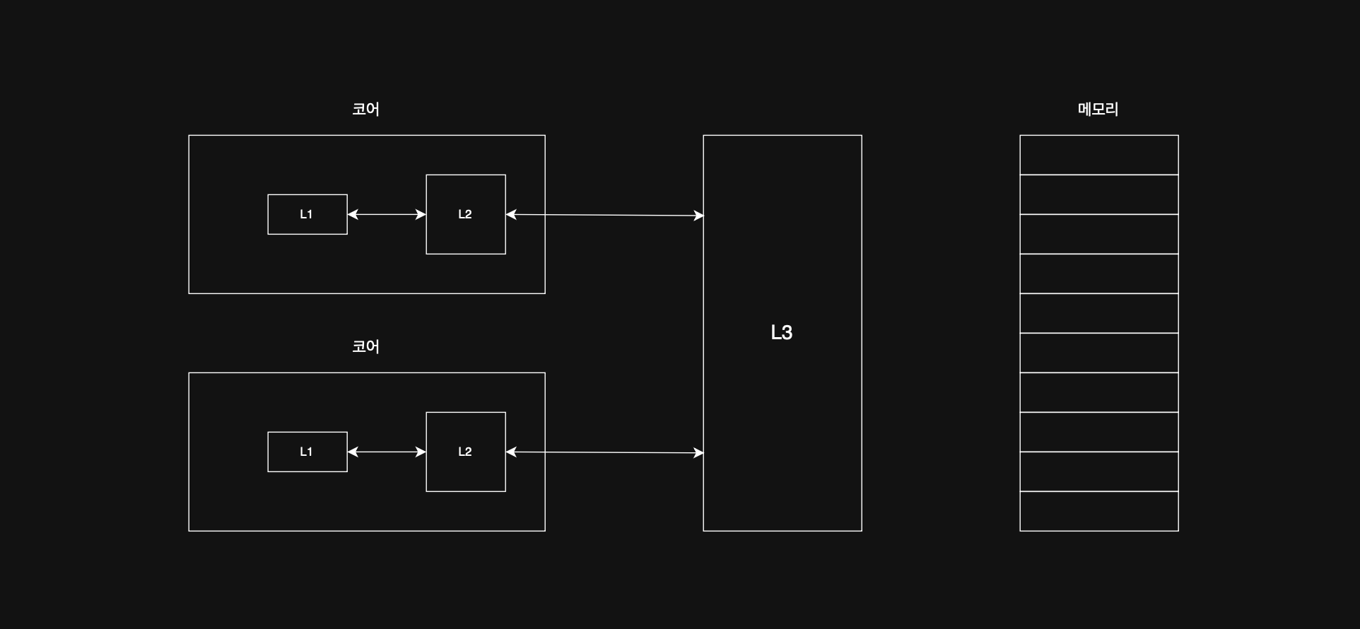 코어와 가장 근접한 캐시 메모리를 L1 캐시, 다음을 L2, 다음을 L3 캐시라고 부른다. 일반적으로 L1, L2 캐시는 코어 내부에, L3 캐시는 코어 외부에 위치한다.