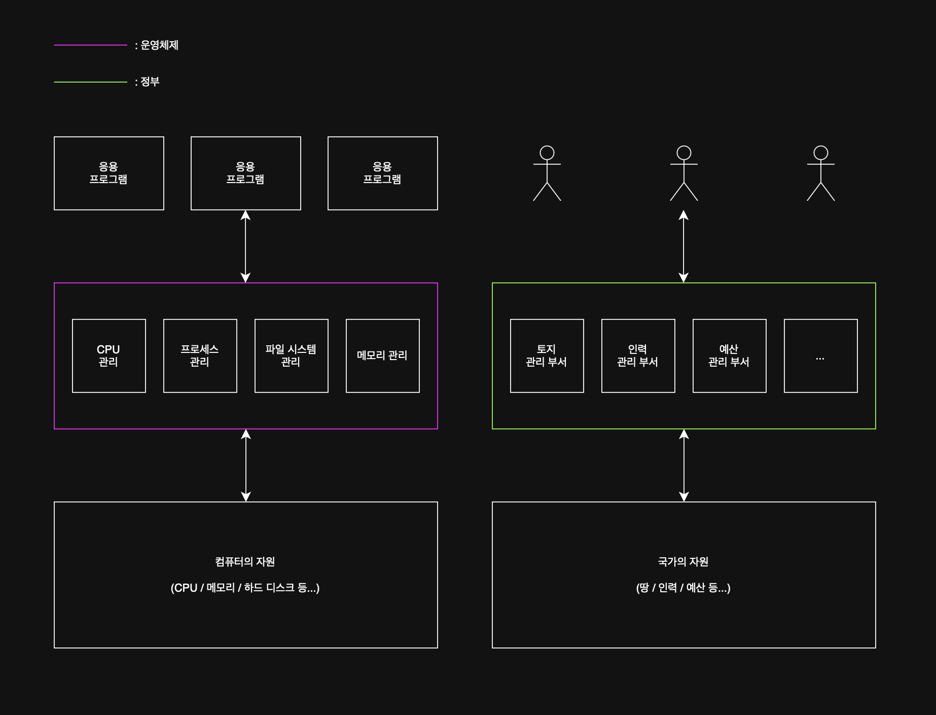 자원을 분배하고 규칙을 통해 시스템을 관리한다는 차원에서, 운영체제는 정부로 비유되기도 한다.