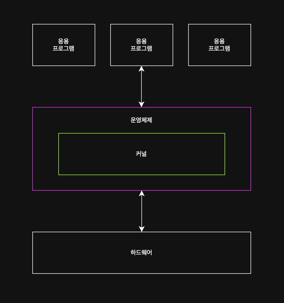 요컨대, OS는 커널 영역에 적재되어, 사용자 영역에 적재된 응용 프로그램들에 자원을 할당하고 이들이 올바르게 실행되도록 돕는다.