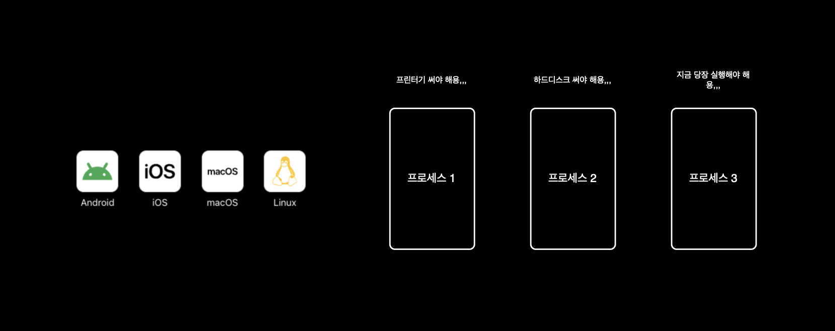 그런데 프로세스별로 요구사항이 다양하다. 이러한 프로세스들을 일목요연하게 관리하고 실행할 수 있어야 한다. 프로세스 관리나 동기화, 그리고 교착 상태 해결 등의 개념에 대해서는 향후 다룰 예정이다.