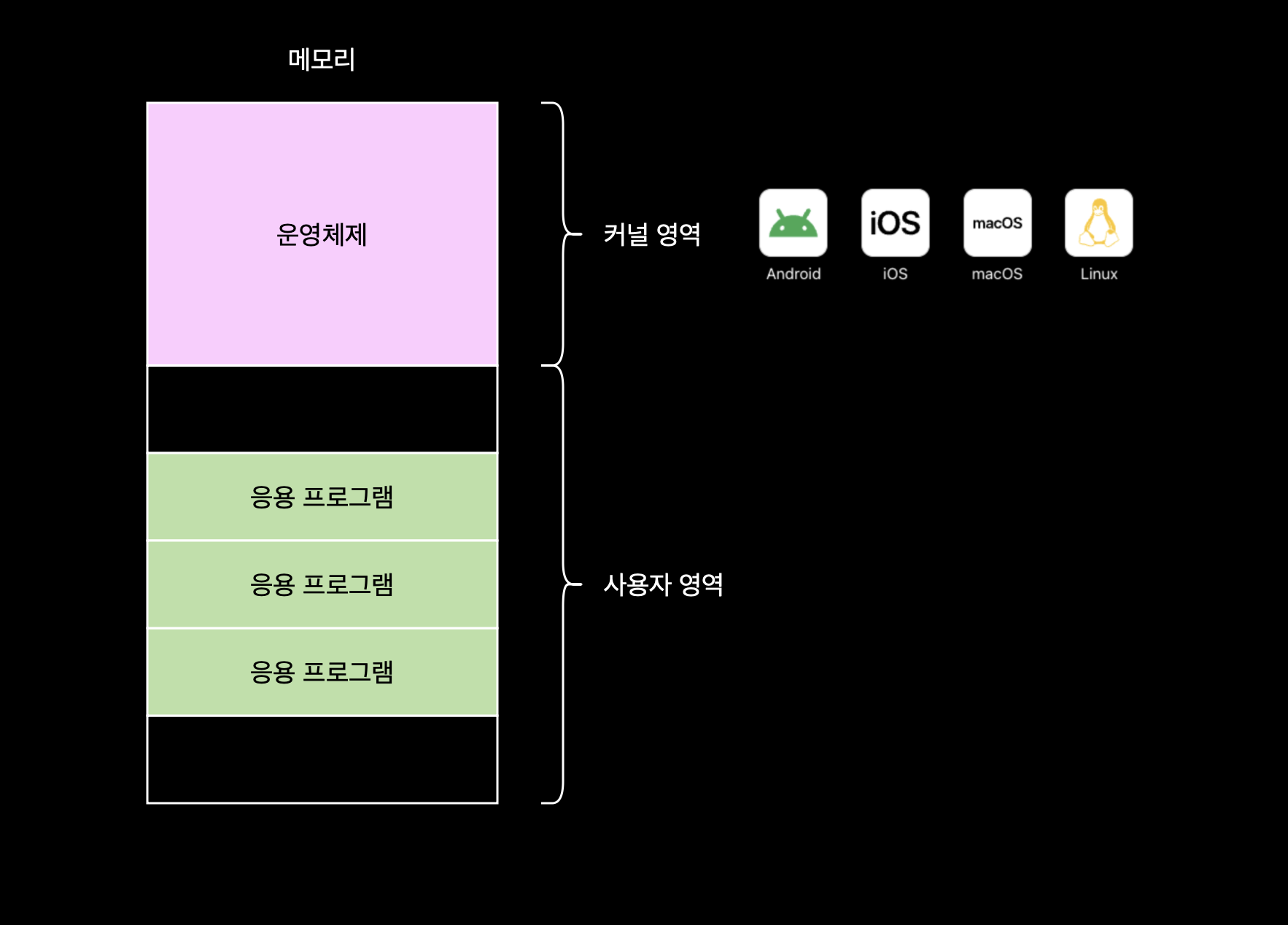 OS 역시 프로그램이기에 다른 프로그램들과 마찬가지로 메모리에 적재된다. 다만 운영체제는 그 성질이 매우 특별해서 컴퓨터가 부팅되는 시점에, 메모리 내 커널 영역(kernel space)에 별도로 적재되어 실행된다. 커널 영역을 제외한, 응용 프로그램이 적재되는 영역을 사용자 영역(user space)이라 한다.