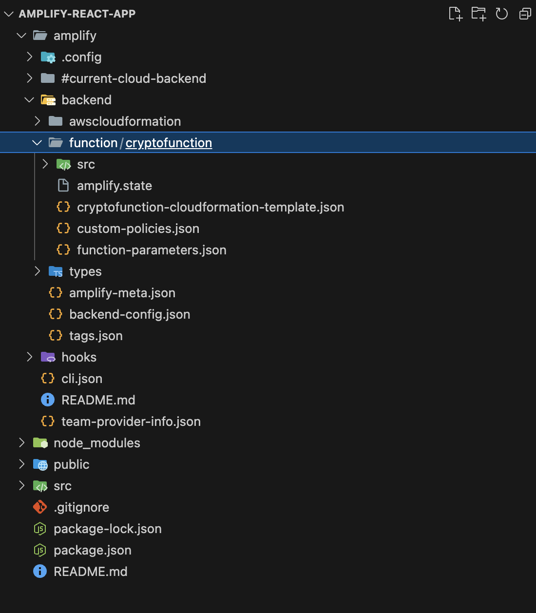 amplify 디렉터리 안에 backend/function/cryptofunction 경로로 새로운 하위 디렉터리들이 생성된 것을 확인할 수 있다. 앞으로 CLI를 통해 생성되는 모든 함수는 이 디렉터리 안에 저장될 것이다.