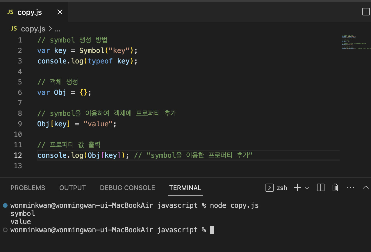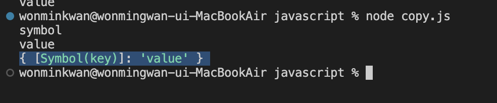 위 코드에서 ```key```를, ```이름이 충돌할 위험이 없는 객체의 유일한 프로퍼티 키```라고 가정하자. 리터럴이 아닌 Symbol 함수를 통해 프로퍼티 키를 생성했고, 빈 객체를 만든 뒤에 'value'를 추가했다. Obj 자체를 console에 찍어보면 프로퍼티가 반환되는 것을 확인할 수 있다.