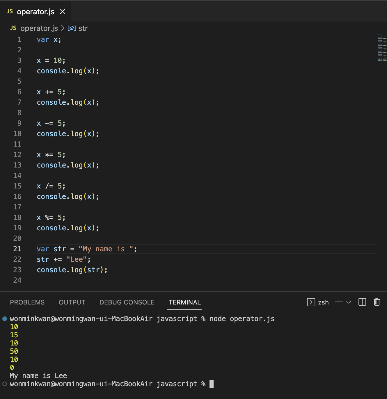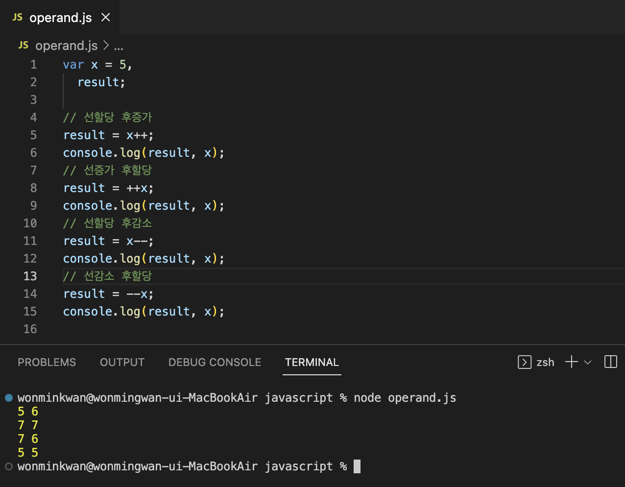 피연산자가 "값"이라는 ```명사의 역할```을 한다면, 연산자는 "피연산자를 연산하여 새로운 값을 만든다"라는 ```동사의 역할```을 한다고 볼 수 있다.