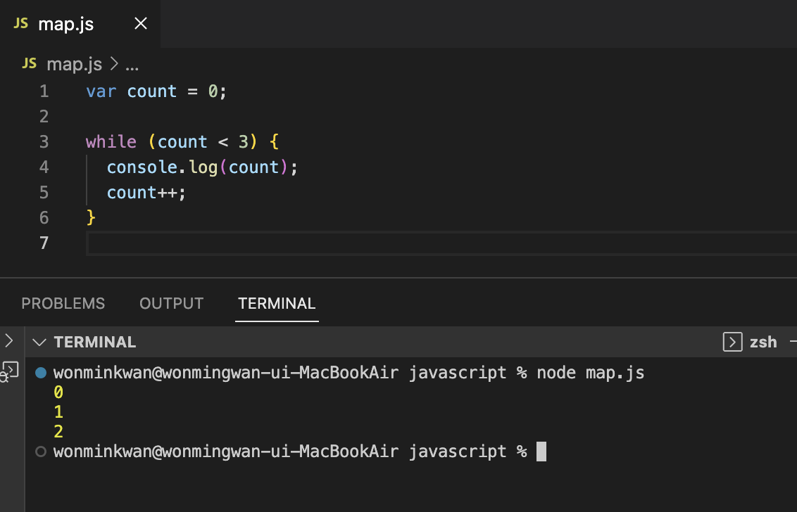 변수 i는 반복을 의미하는 iteration의 i이다. 일반적으로 i를 변수명으로 사용한다. 1. 가장 먼저 변수 선언문 'var i=0'이 실행된다. 변수 선언문은 단 한 번만 실행된다. 2. 변수 선언문의 실행이 종료되면 조건식이 실행된다. 현재 i 값은 0이므로 조건식 평가 결과는 true다. 3. true라는 평가 결과에 따라 코드 블록이 실행된다. 그런데 이때 ``증감문으로 실행 흐름이 이동하는 것이 아니라 코드 블록으로 실행 흐름이 이동``한다. 4. 코드 블록의 실행이 종료되면 증감식 i++가 실행되어 i의 값은 1이 된다. 5. 이후에 ``변수 선언문이 아니라 조건식이 실행``된다. 현재 i 값은 1이므로 조건식 평가 결과는 true다. 6. 동일한 방식으로 진행하다가 i의 값이 2가 되면 for 문의 실행이 종료된다.