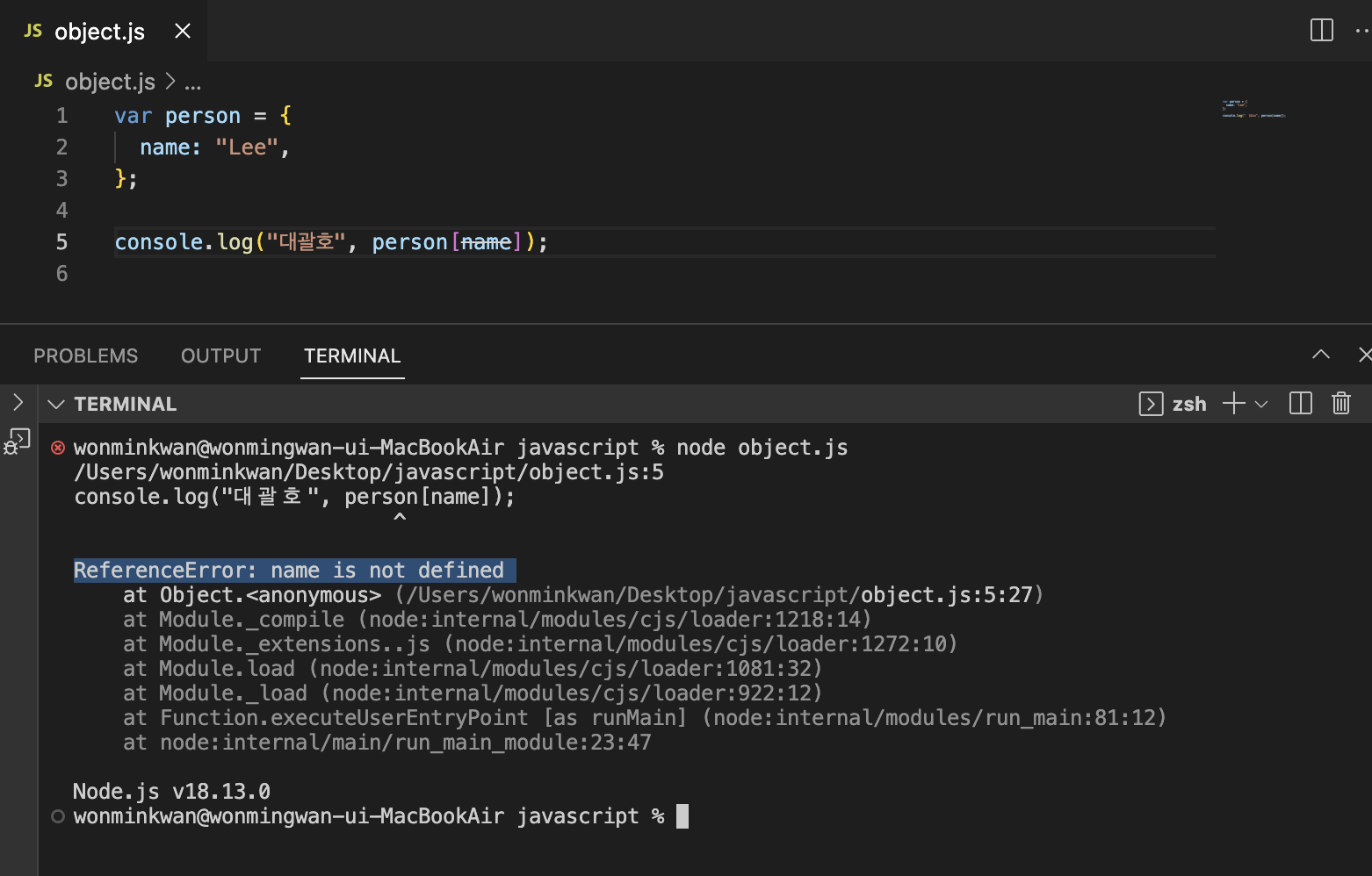대괄호 표기법을 사용하는 경우 대괄호 내부에 지정하는 프로퍼티 키는 반드시 ```따옴표로 감싼 문자열```이어야 한다. 그렇지 않으면 자바스크립트 엔진은 ```식별자```로 해석한다.